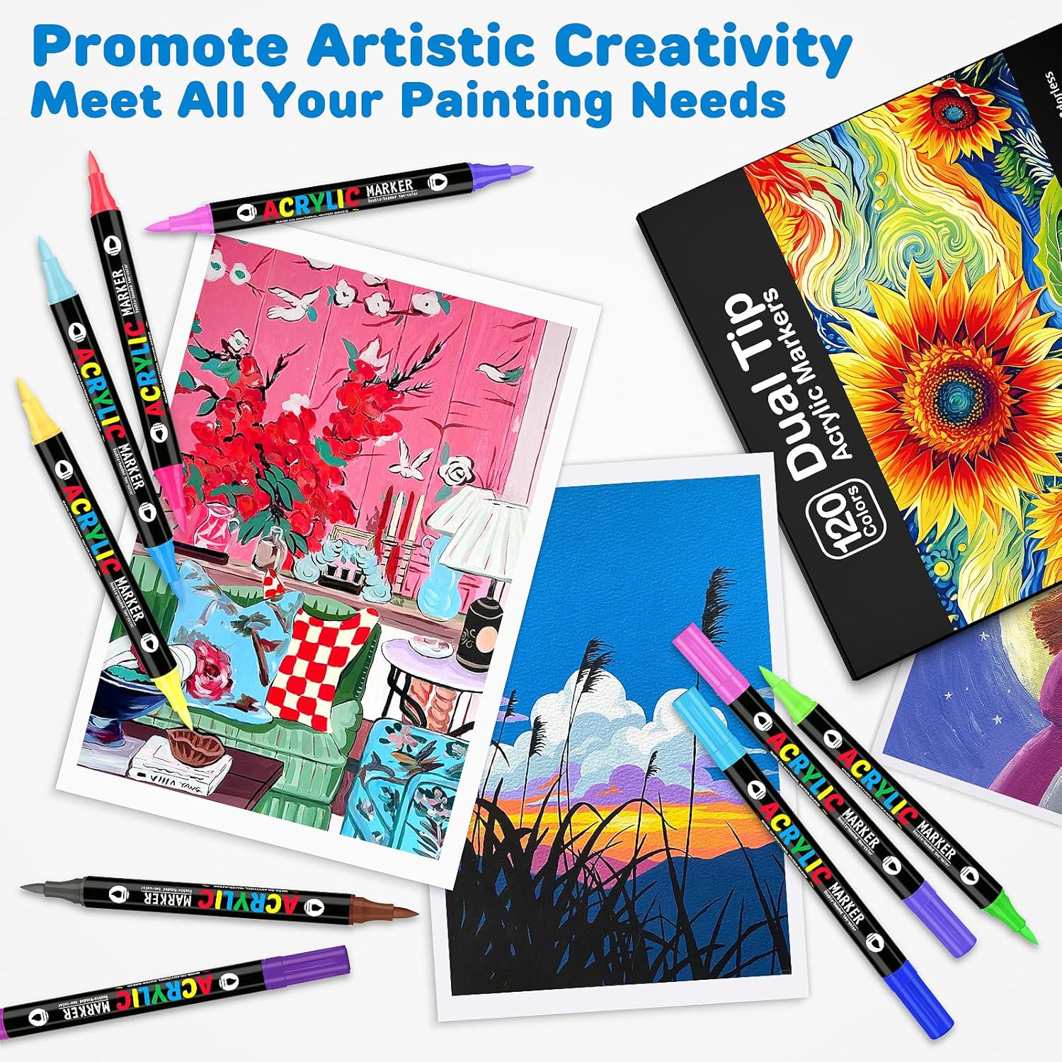 - Creative Double-head Design: Our acrylic paint markers use the innovative double-head design allows 60 paint pens to have 120 highly saturated colors, saving 50% of storage space while bringing double the creative possibilities. Whether it is professional illustration or daily graffiti, this acrylic paint set can double your creative efficiency.