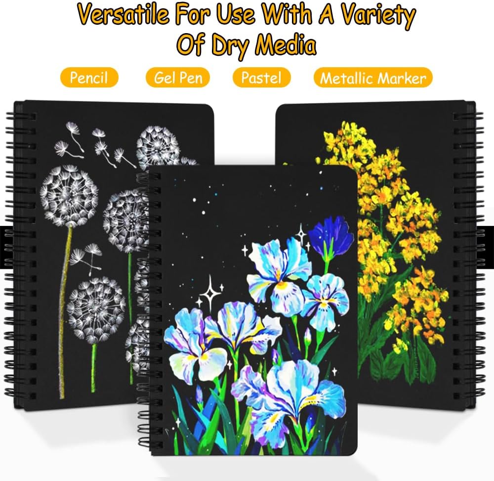 - Premium Black Paper: The mixed media sketchbook is ideal for dry media like Pencils, Pastels, Gel pen, and Metallic Markers. Featuring a premium black ground that dramatically intensifies white and colored mediums, this artist-grade sketchbook delivers unparalleled vibrancy