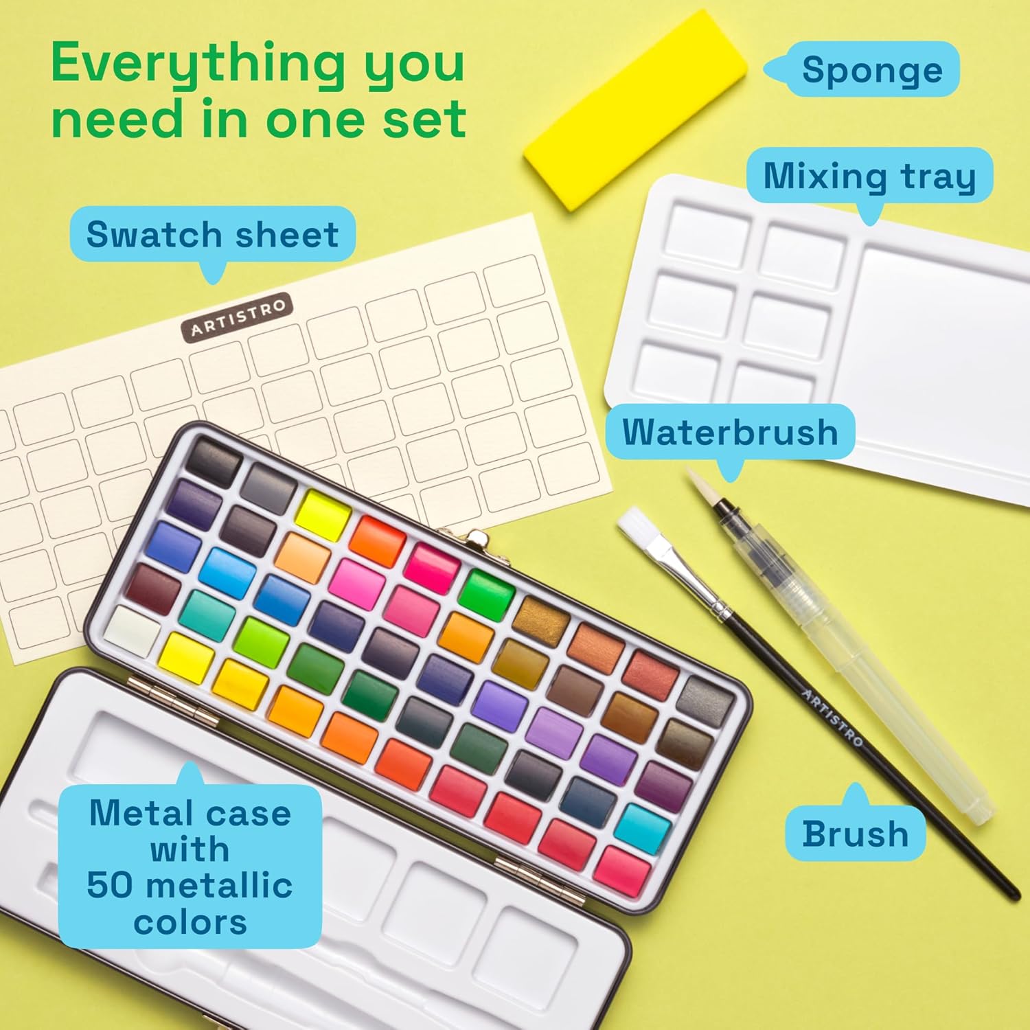 ARTISTRO 50 Watercolor Paint Set, Vivid Colors in Portable Box, Palette set. Perfect Travel Watercolor Set for Artists, Amateur Hobbyists and Painting
