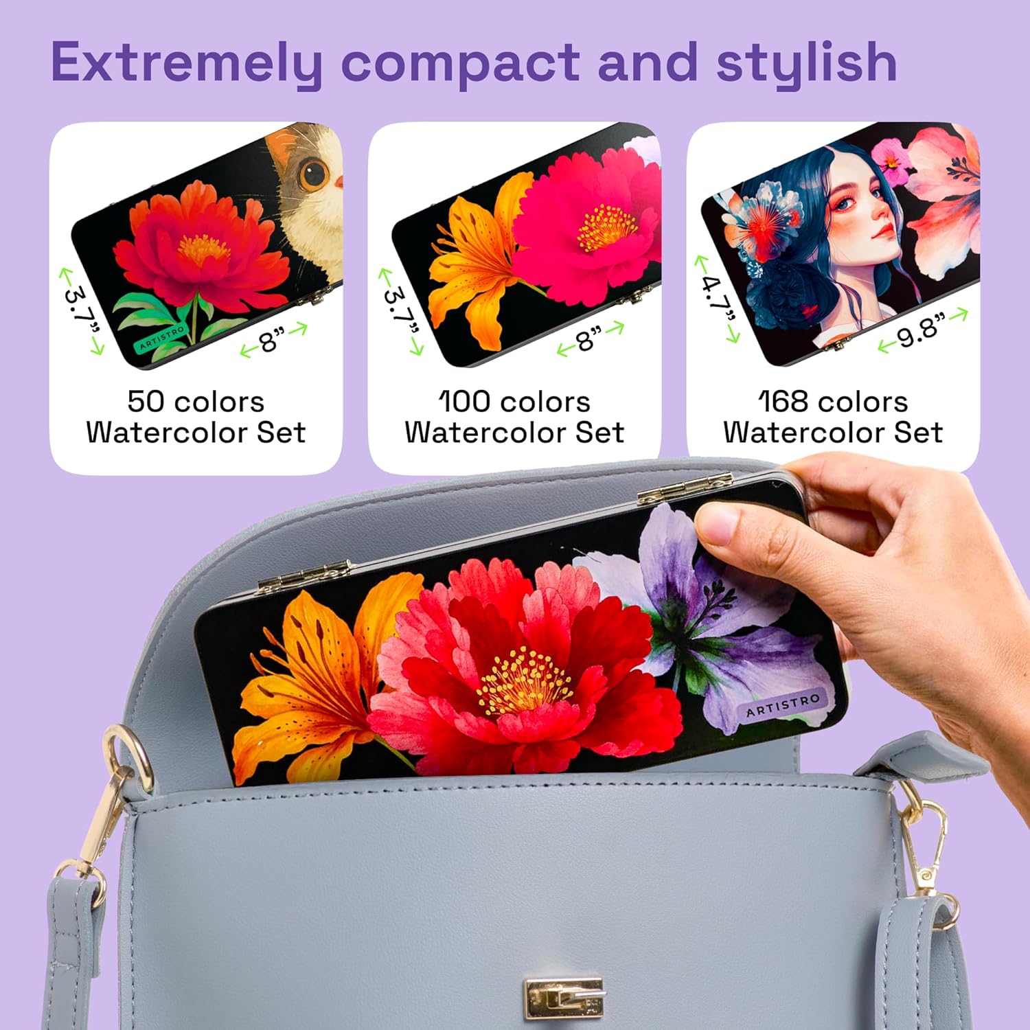 ARTISTRO 100 Watercolor Paint Set, Vivid Colors in Portable Box, Palette set. Perfect Travel Watercolor Set for Artists, Amateur Hobbyists and Painting