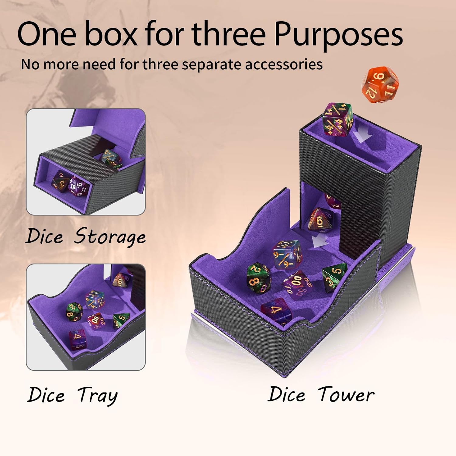 Dice Tower and Tray, Portable Commander Deck Box, Foldable Dice Storage Box for Dungeons and Dragons Rolling Tray Black/Violet