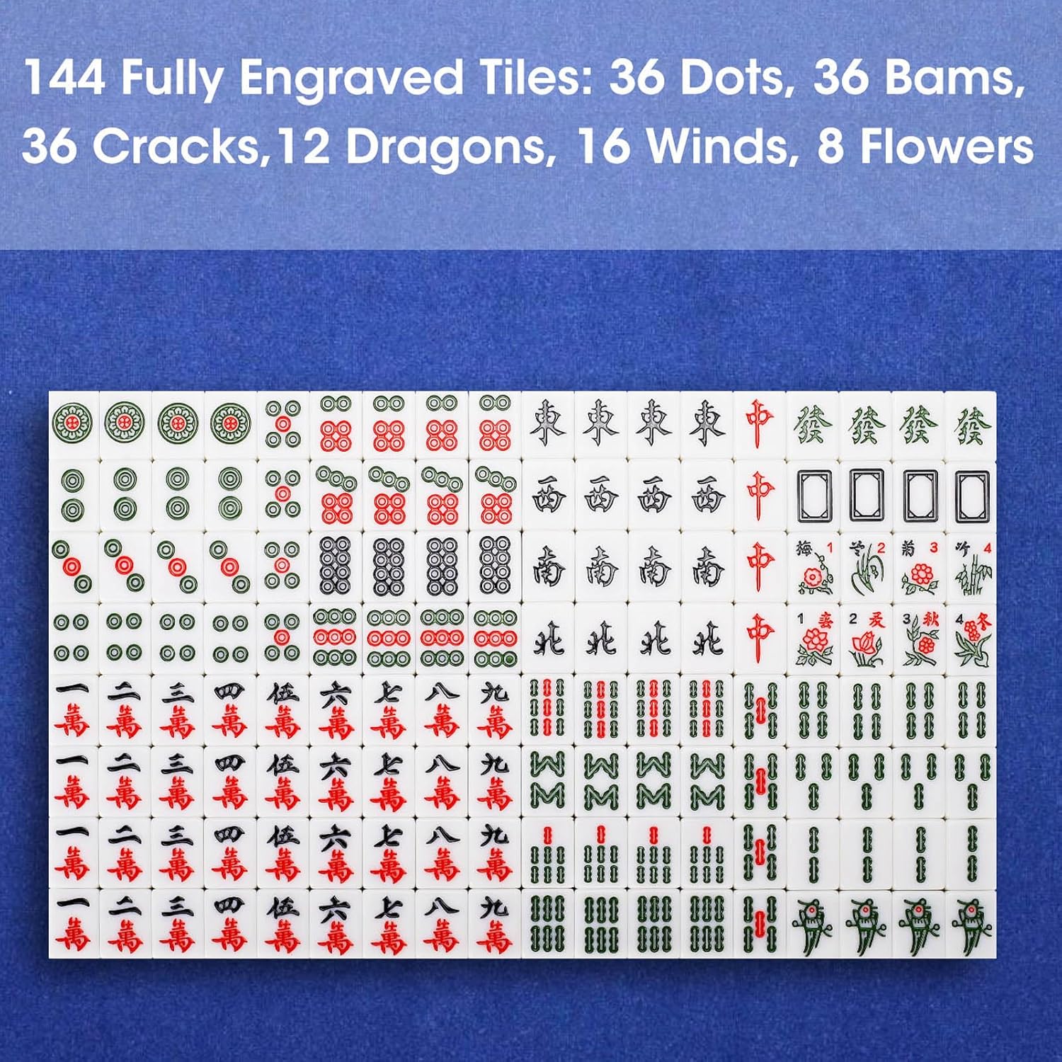 - 【Mahjong Tile Design】 Set Includes 144 Tiles (36 Circles, 36 Bamboos, 36 Characters, 12 Dragons, 16 Winds, 8 Flowers And Seasons) With Chinese Characters Engraved Clearly.