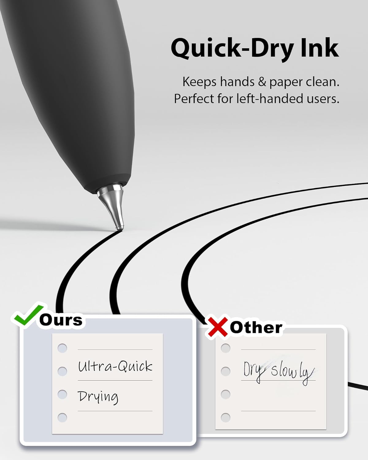 - Quick-Dry Long Lasting Ink:0.7mm black ink can slide effortlessly, dry immediately, & is not easily dirty. It has a high-capacity reservoir (up to 1300 meters), which is very suitable for left-handed & right-handed users.