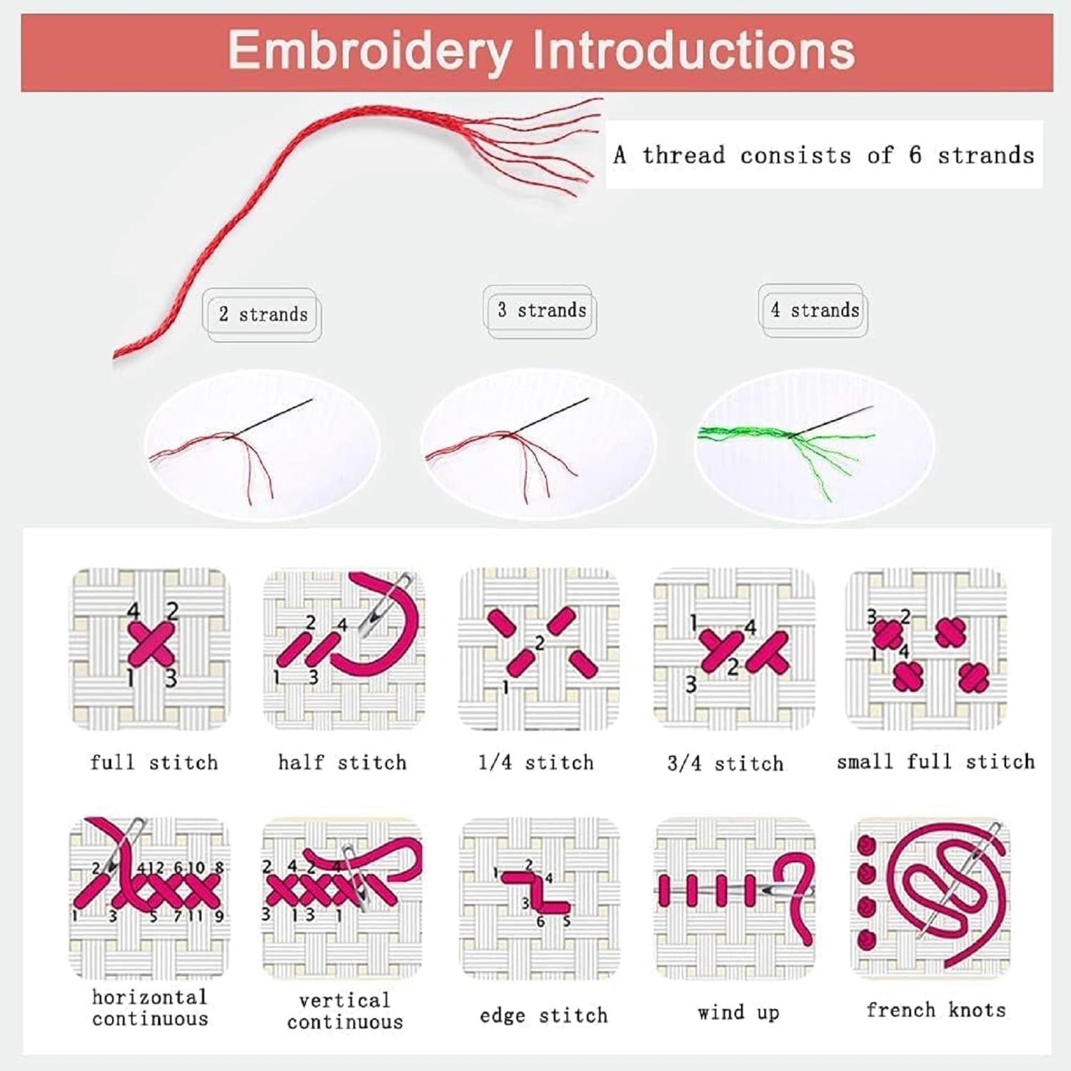 - ✜How many wires should be used: For 11CT type, please use 3 strands of wire and 2 strands of wire for the back seam. A wire consists of 6 strands, so you need to divide the 6 strands into two 3 strands before starting work.