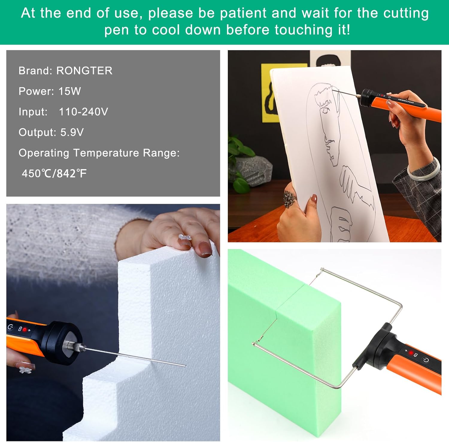 - 【Easy to Use】Rongter 4 in 1 electric styrofoam cutting tool comes with a metal support frame for resting the heated tip, so you don't worry about where to rest it when you want a break from your work. After it cools down, please wipe the heating needle with copper brush to avoid blackening and hardening caused