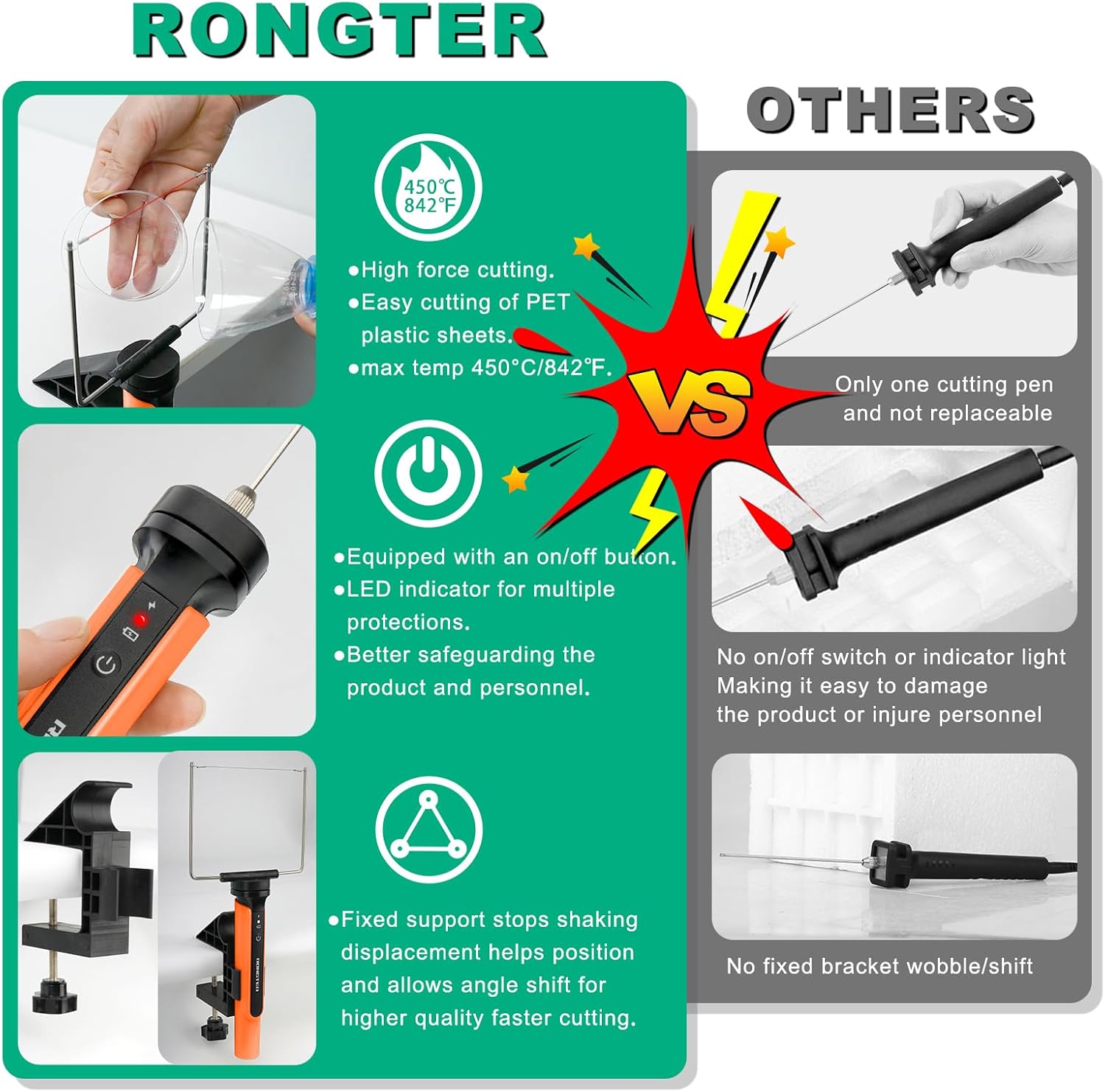 - 【Smooth and Efficient Cutting】Rongter hot wire foam cutter is FCC certified, heats up faster and more evenly than normal electric heating pens, The U-shaped and F-shaped tip can be heated up to 842℉/450℃ during use, and the 2in/4in tip can be heated up to 350℃. The hot wire cutting pen can cut foam block from any angle smoothly and efficiently just like butter, seals the edges clearly, and eaves No Debris