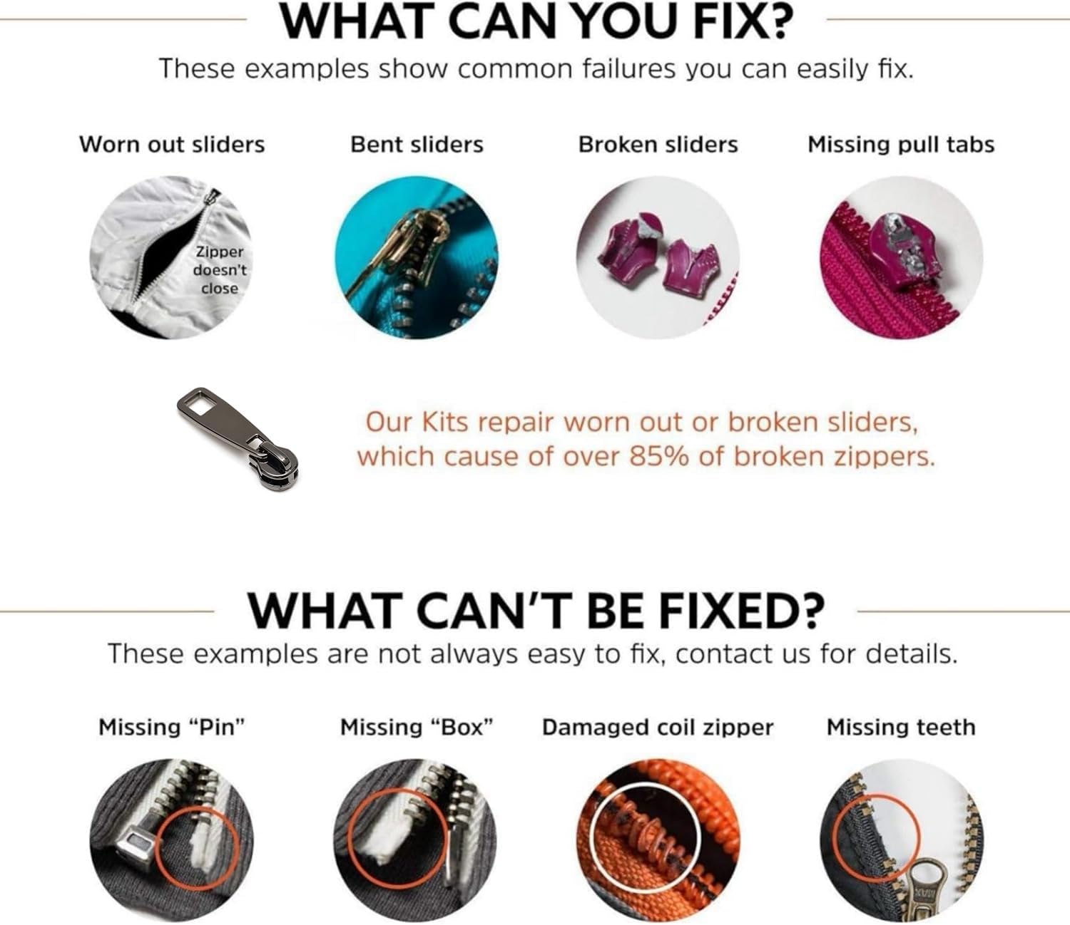- Size: Be sure to pay attention to the size of the zipper you need to repair, <b>this only fits for #8 metal or nylon zipper teeth width 7 to 8 mm / 0. 28 to 0.32 in)</b>. Or you can find a number on the zipper full to make sure it is 8