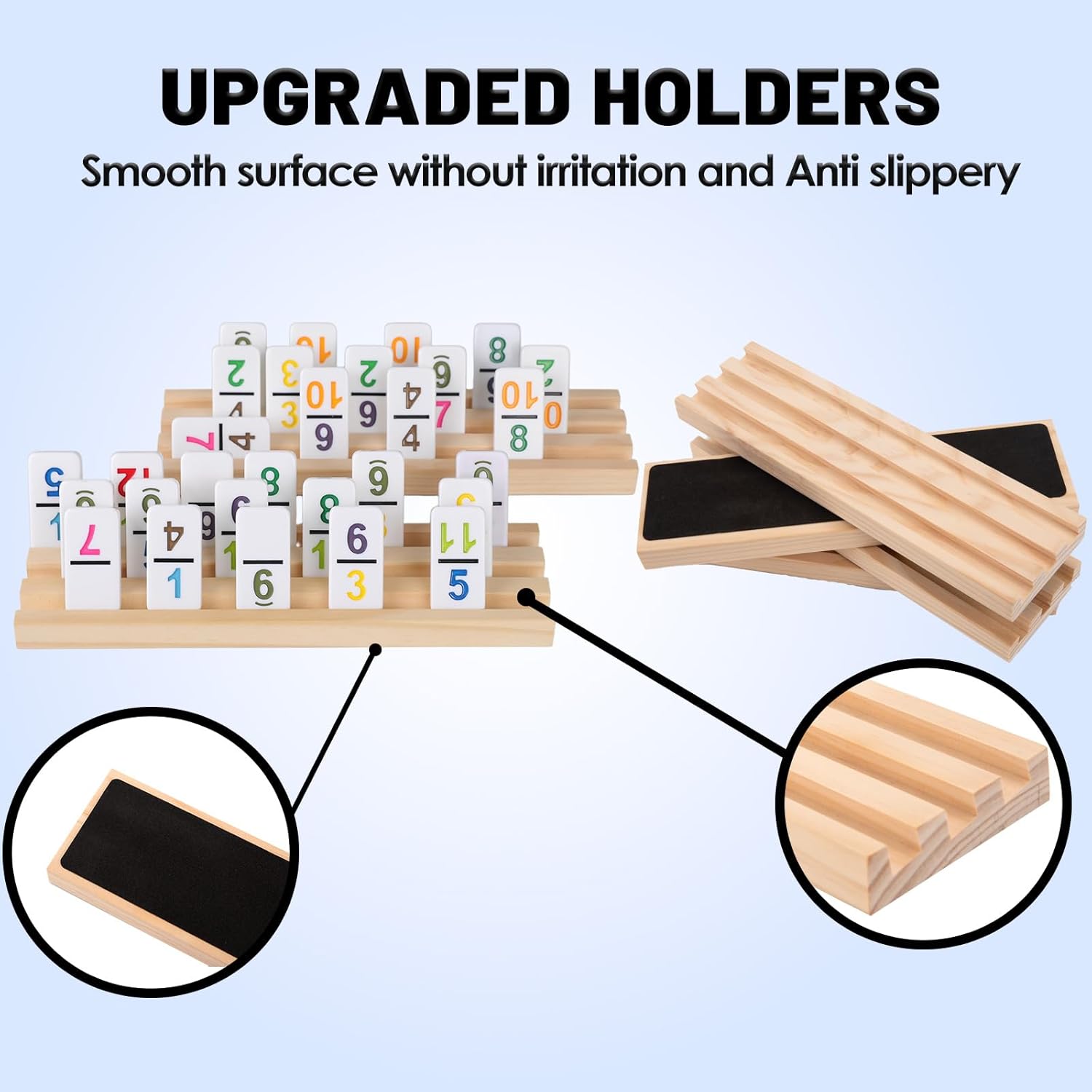 - 8 PREMIUM WOODEN HOLDERS: Our double 15 domino set boasts 3 subtly slanted slots per tray. The cleverly design enables maxmum 10 tiles standing neatly in the racks