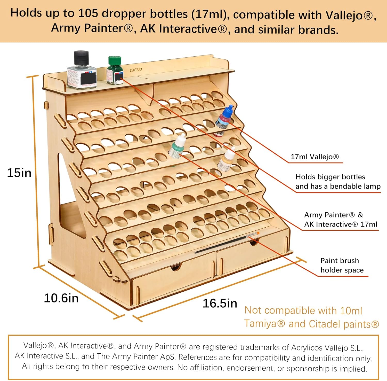 - Product Details: The wooden paint storage rack features 105 holes (1" diameter) that fit most standard paint bottles, keeping your workspace organized. Includes a detachable holder for up to 71 paint brushes and tools, plus 2 drawers for storing smaller accessories. Comes with 6 miniature stands for precise detailing—perfect for miniature painting. Compatible with Vallejo, Army Painter, and more.