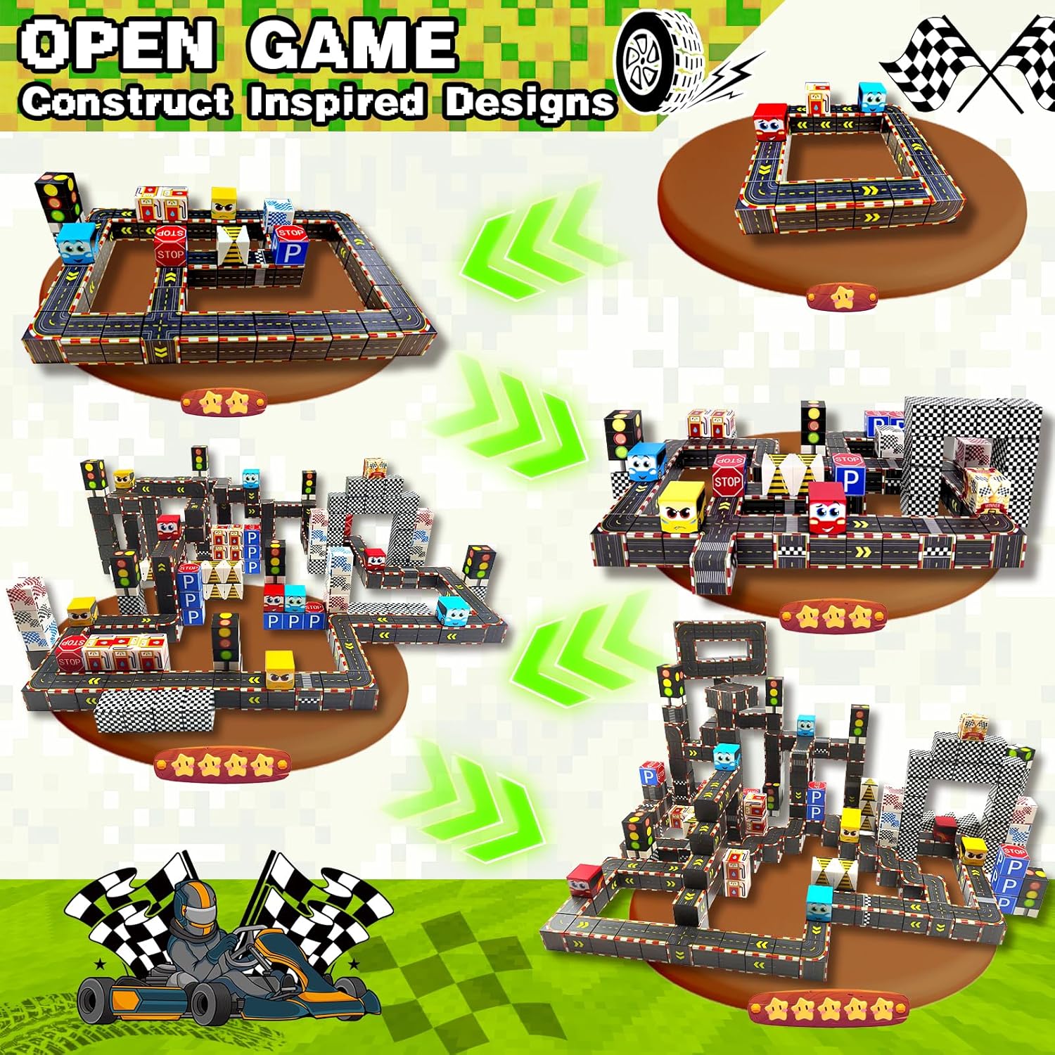 - 🏎 Unique Racing-Themed Magnetic Blocks: Unlike nature-themed sets building toys, this racing version brings speed , challenge, and creativity to every build. Try our racing-themed magnetic building blocks set and let kids dive into a world of speed and imagination! This 100-piece magnetic cubes set includes race cars, tracks, checkered flags, parking signs, trophies, roadblocks, traffic lights, and more. Easy to build and take apart repeatedly, with standard 1-inch tiles fully compatible with major brands. Aleath Magnetic toys that fuel creativity while keeping kids off screens