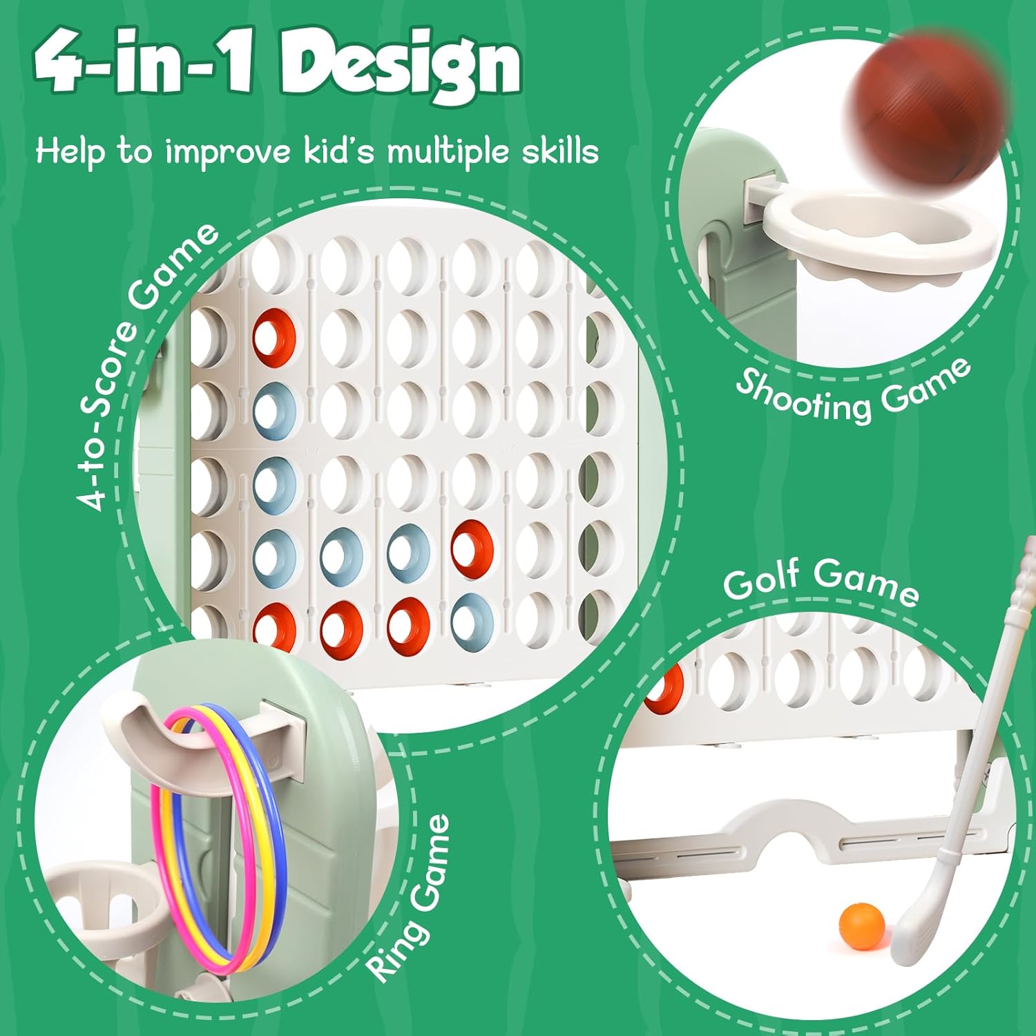 - 4 IN 1 GAME: Beyond the classic Four-in-a-Row connecting game, we've also brought you exciting basketball shooting, golf, and tossing games, offering diverse entertainment options. Plus, there are convenient cup holders on both sides of the frame, and huge mesh at the bottom can hold all fallen discs, so you don't need to waste time picking up jumping discs.