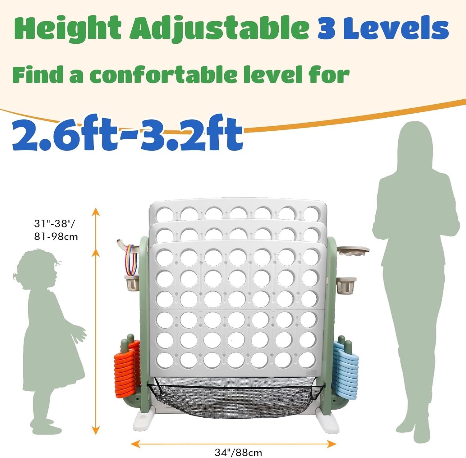 - Adjustable Height: This giant Four-in-a-Row connecting game features an innovative design with three adjustable height settings: 31 inches, 35 inches, and 38 inches. It perfectly accommodates players of all ages, from children to adults, ensuring everyone can participate and enjoy the fun equally.