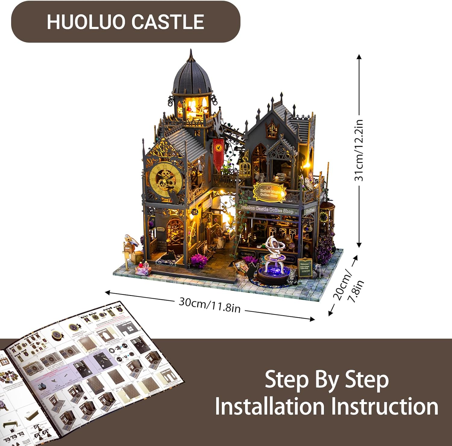 DIY Miniature House Kit, Dollhouse for Adults to Build, Birthday/Christmas Day Gift for Family and Friends, Magic Castle, Haunted Dollhouse, Prefab Tiny Home with LED Lights(Huoluo Castle)