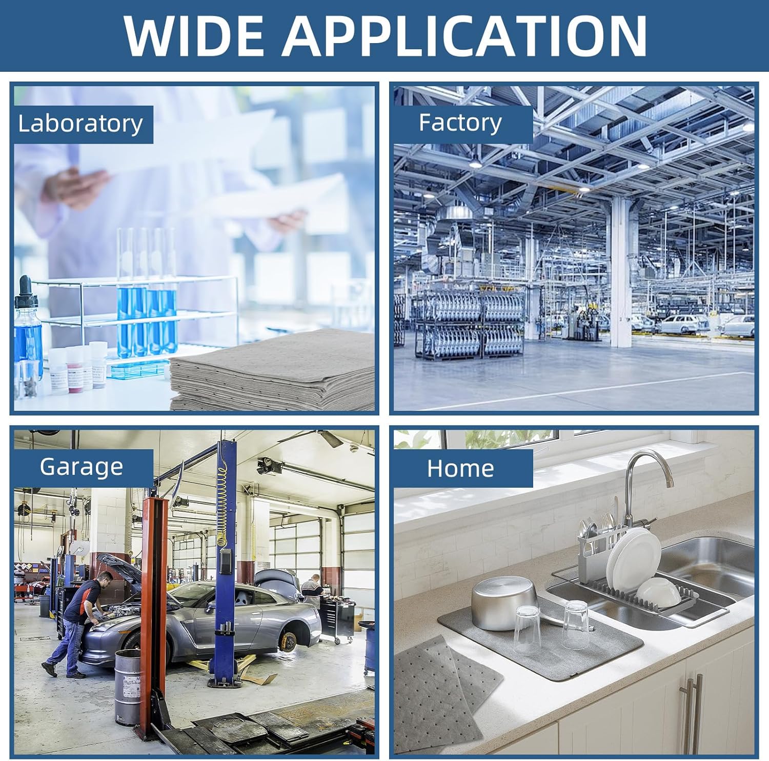 - ALL-PURPOSE ABSORBENT PAD: These small and portable oil spill mats are economical for small tasks and cleanups, especially for light spills in workshops, labs, classrooms, homes and more, keeping clean and dry. They are not only used as universal absorbent pads, but also can be used as garage mats, kitchen mats, drip drop pads, or splash pads.