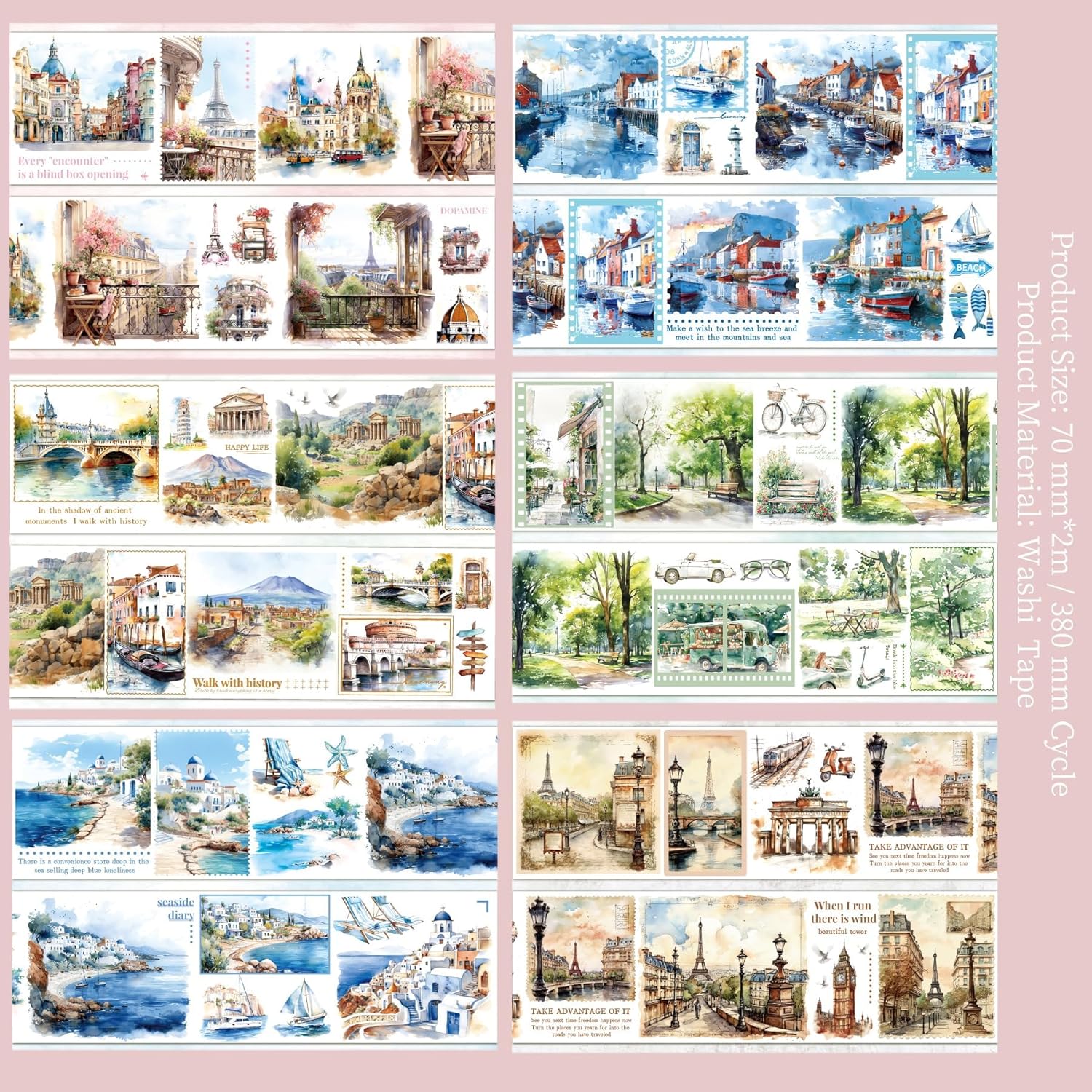 - Tape Sets:You'll receive 6 rolls landscape washi tape,each depicting a natural scene from the world,which elements of ancient cities, islands, parks, etc