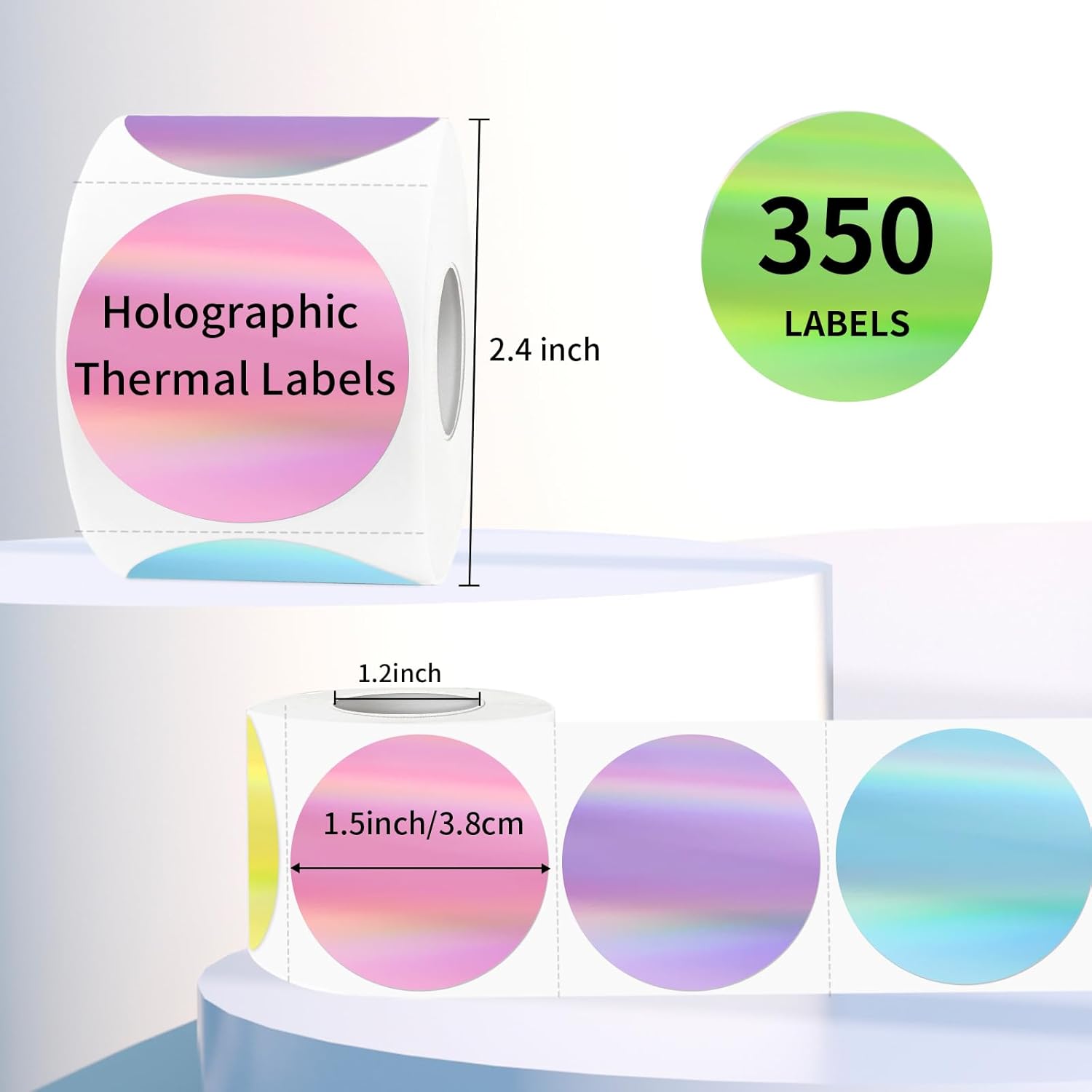 - 1.5" Circle Holographic Thermal Labels Sticker, 350 Labels/Roll. It’s printable with a thermal printer, No ink toner or ribbons are needed