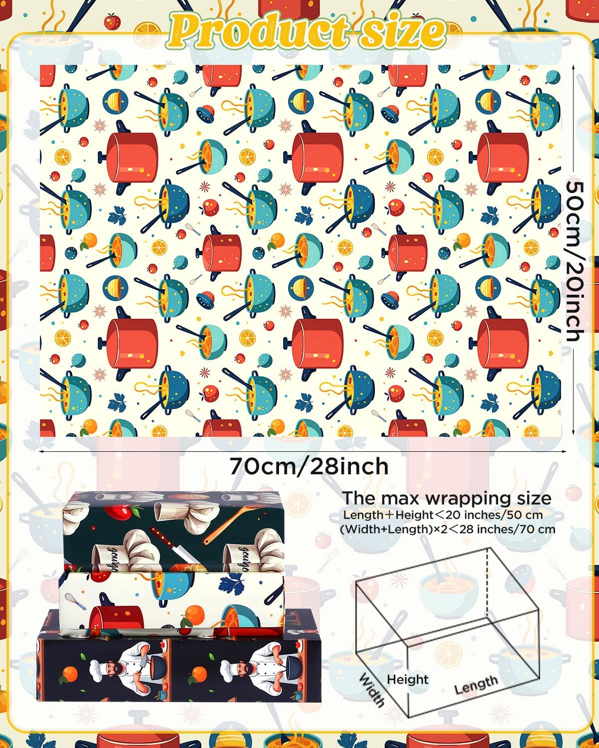 - ADORABLE DESIGN: Our cooking wrapping paper is beautifully printed with a cheerful assortment of kitchen-themed elements: vibrant vegetables (tomatoes, peppers, carrots), a busy chef cooking, chef's hats, spoons and other cooking utensils, pots, and a finished soup. The delightful color palette creates a warm and inviting aesthetic, perfect for birthdays, kitchen-related gifts, and adding a personal touch. Wonderful supplies for gift wrapping, birthdays, cooking parties, and more!