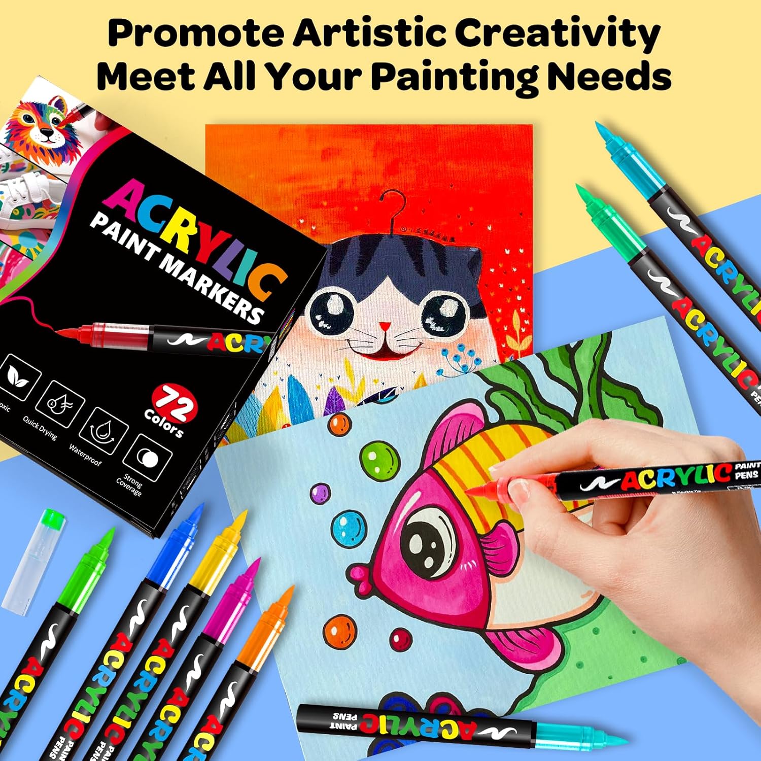 - Colorful Acrylic Paint Markers - Acrylic paint markers offers a selection of 72 rich and colorful options. Each paint markers are designed with unique and vibrant colors that cater to all your creative need. A variety of colors allows you to let your imagination run wild and have unlimited creative possibilities. Perfect choice for both beginners and professional artists looking to enhance their designs.