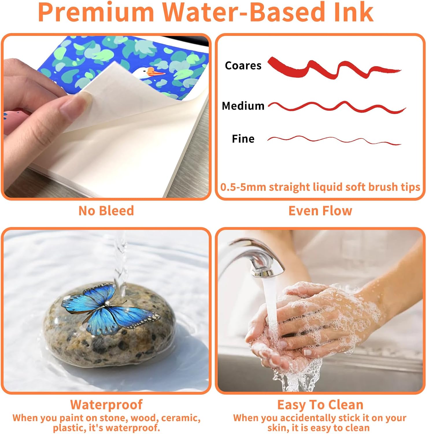 - Soft Brush Tip & Effortless Control: The flexible brush tip allows ink to flow effortlessly without pressing, enabling smooth 0.5-5mm line variations by adjusting the angle. Water-based ink that won't bleed through paper