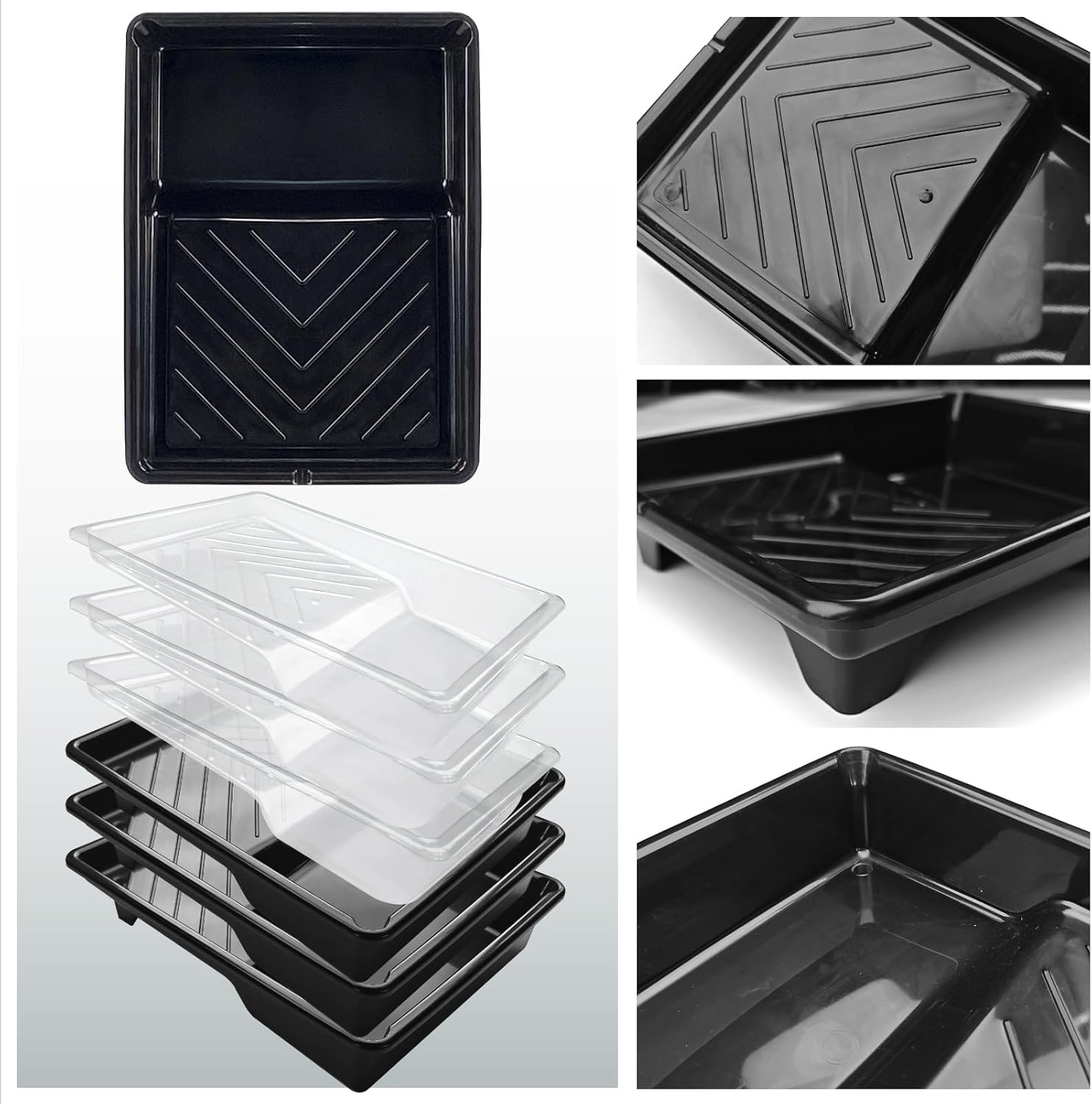 - Get Complete Paint Tray Set: Includes 3 sturdy reusable black plastic paint trays and 3 matching clear disposable liners for mess-free painting.