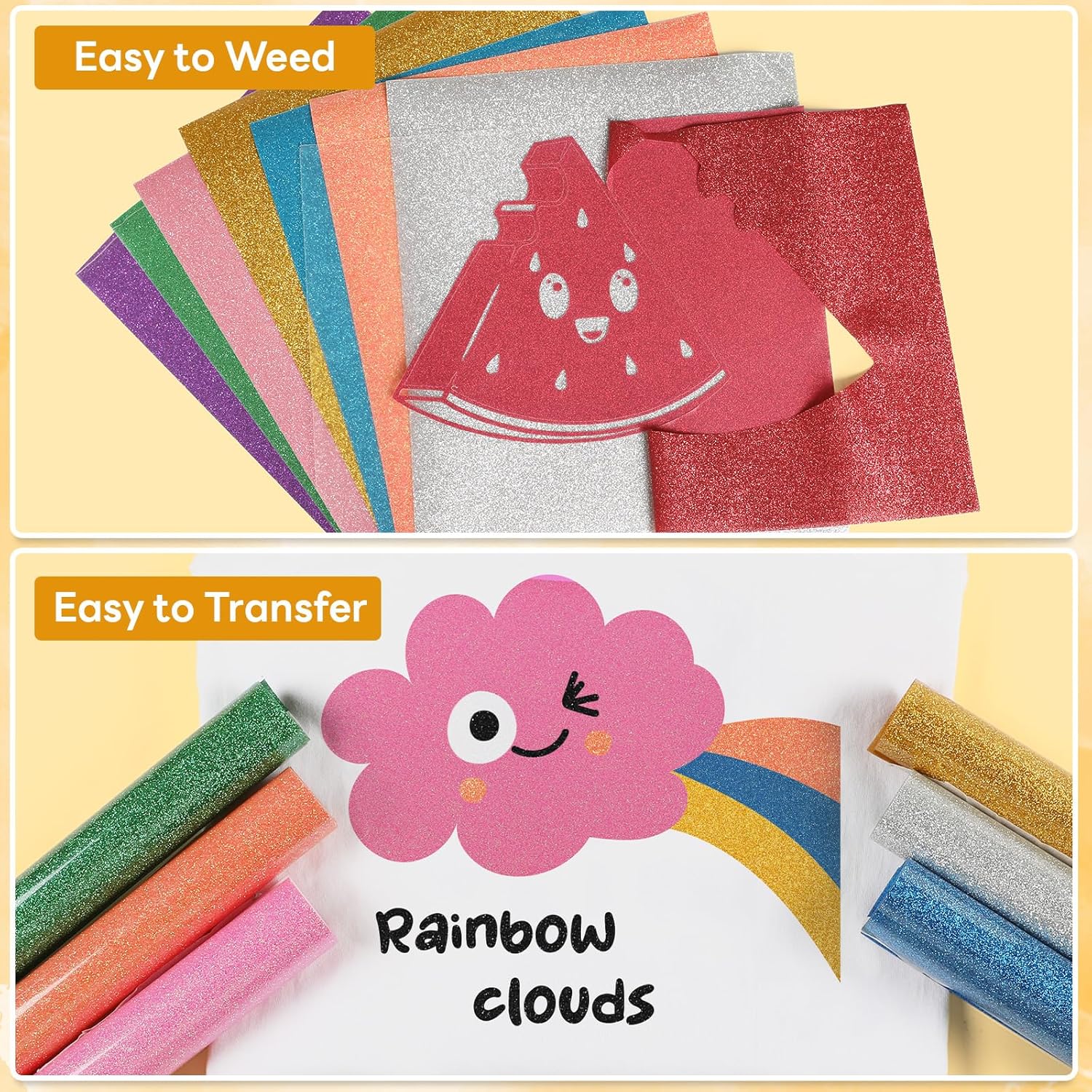 - 【Easy to Cut & Weed & Transfer】 Our premium glitter HTV features a silky-smooth surface for crisp cuts, even on the most intricate designs. Achieve flawless results with clean weeding and precise transfers every time. glitter vinyl heat transfer temperature- and pressure-sensitive, allowing it to transfer smoothly to fabric using a heat press or a home iron. Layer multiple colors to create stunning glitter effects!