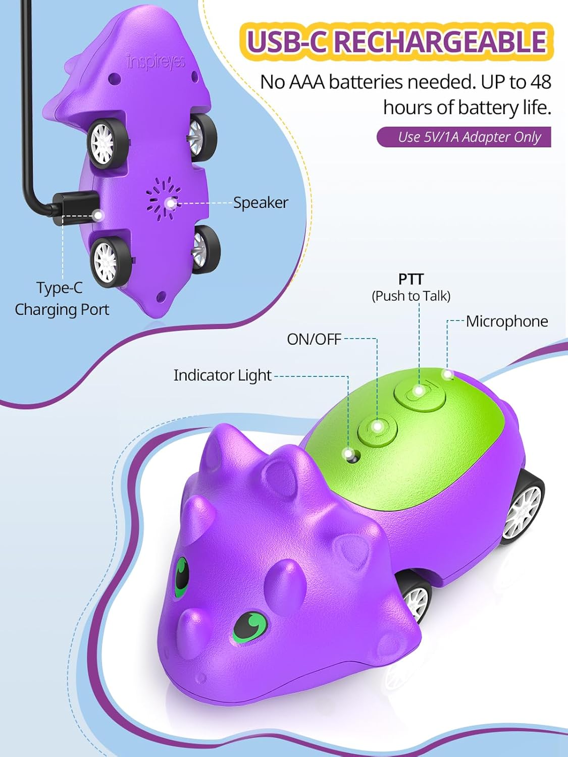 - [Rechargeable, Long-Lasting] : No more wasting money on endless AAA batteries! Each dino walkie-talkie toy car charges easily with the included USB-C cable and lasts up to 48 hours on a single charge, keeping the dino adventures going anytime, anywhere. Please Note: The included cables are designed for these dinosaur toys only and should not be replaced with other cords.