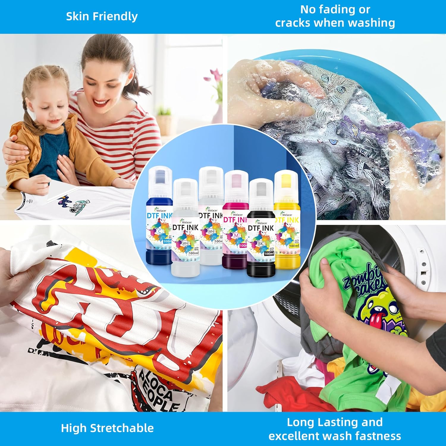 Upgraded Auto-Fill DTF Ink for ET-8550, ET-8500, 100mlx6 Heat Transfer Ink Conversion Kit, High Density Pigment Ink - Compatible with All DTF Films&Printers(Anti-UV, ICC-Free)