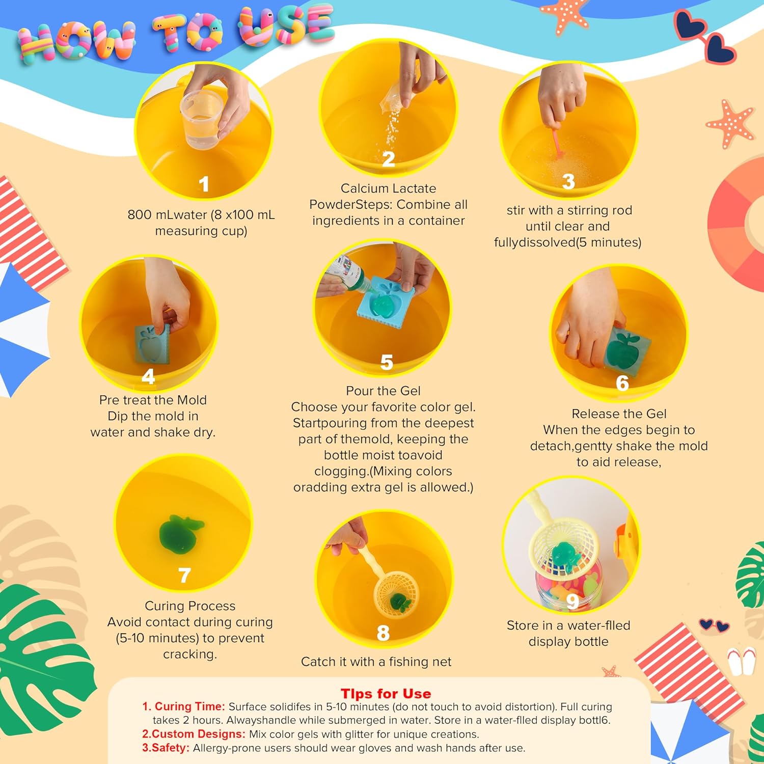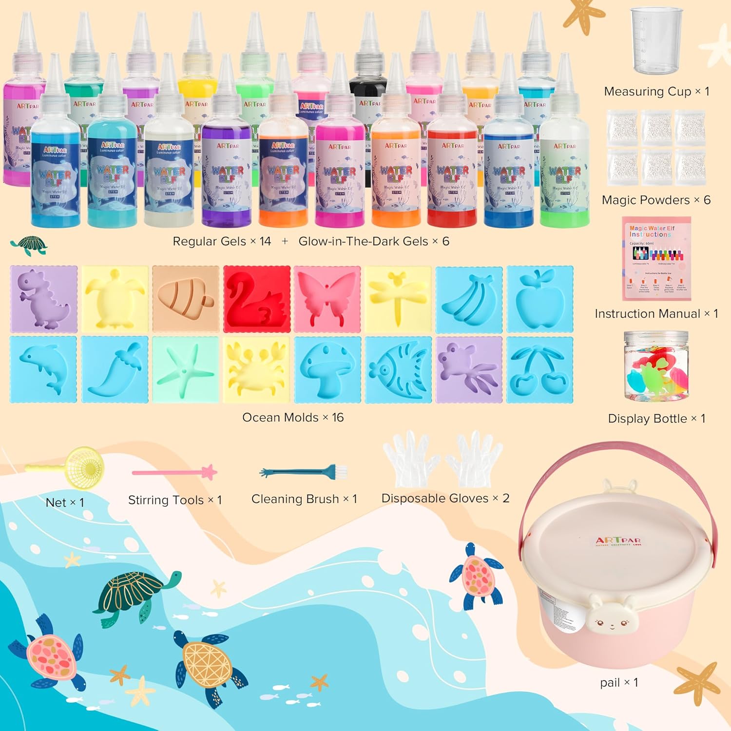 - ARTPAR Aqua Fairy Water Gel Kit: Contains 20 gels (14 regular + 6 glow-in-the-dark), 16 marine molds, 6 magic powders, 1 net, 1 bucket, 1 measuring cup & 1 display bottle.