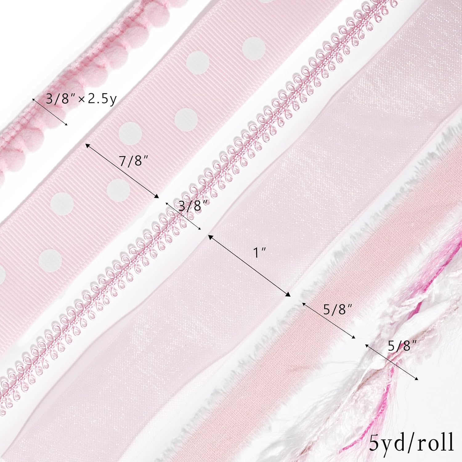 - Variety of Designs: Includes 6 different pink ribbons—grosgrain polka dot, chiffon, sheer organza, fringe trim, pom pom, and lace. From plain grosgrain to narrow rick rack, the mix of patterns and textures fits almost any project