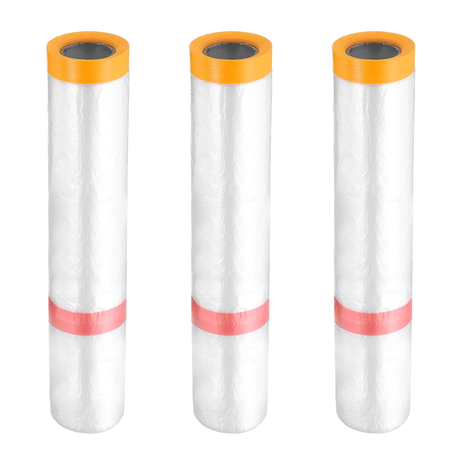 HARFINGTON 3 Rolls Pre-Taped Masking Film 157.5" x32.8ft Double Adhesive Tape and Drape Painters Plastic Drop Cloth Film with Tape Plastic Sheeting for Automotive Painting Covering
