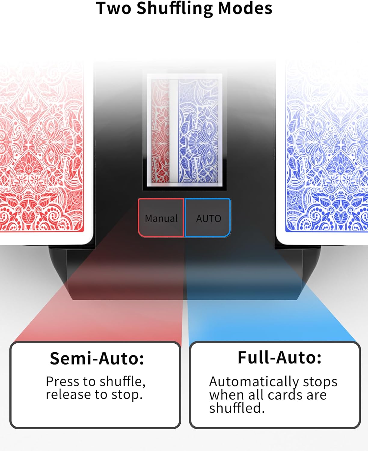 • 【Full-Auto & Semi-Auto Shuffle Modes】 In Full-Auto mode, a single press shuffles all cards and stops automatically. For precise control, Semi-Auto mode lets you hold to shuffle and release to stop.