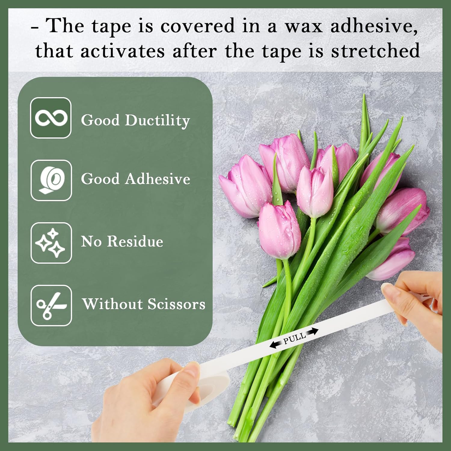 - Usage Tips: With a wax adhesive coating, this flower tape activates upon stretching, allowing for easy tearing by hand to swiftly bond flower stems and create bouquets. The floral tape adheres solely to itself and is not of the self-adhesive variety