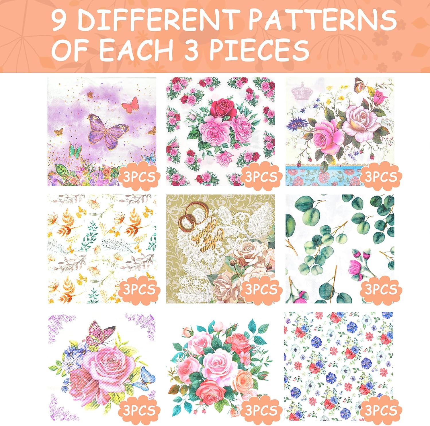 Decoupage Napkins Assorted Floral 27 Pack 9 Styles for DIY Crafting Birthday Party , Decorative Decoupage Napkins Cocktail Paper ,Each Unfolded 13 Inch (Colorful Floral)