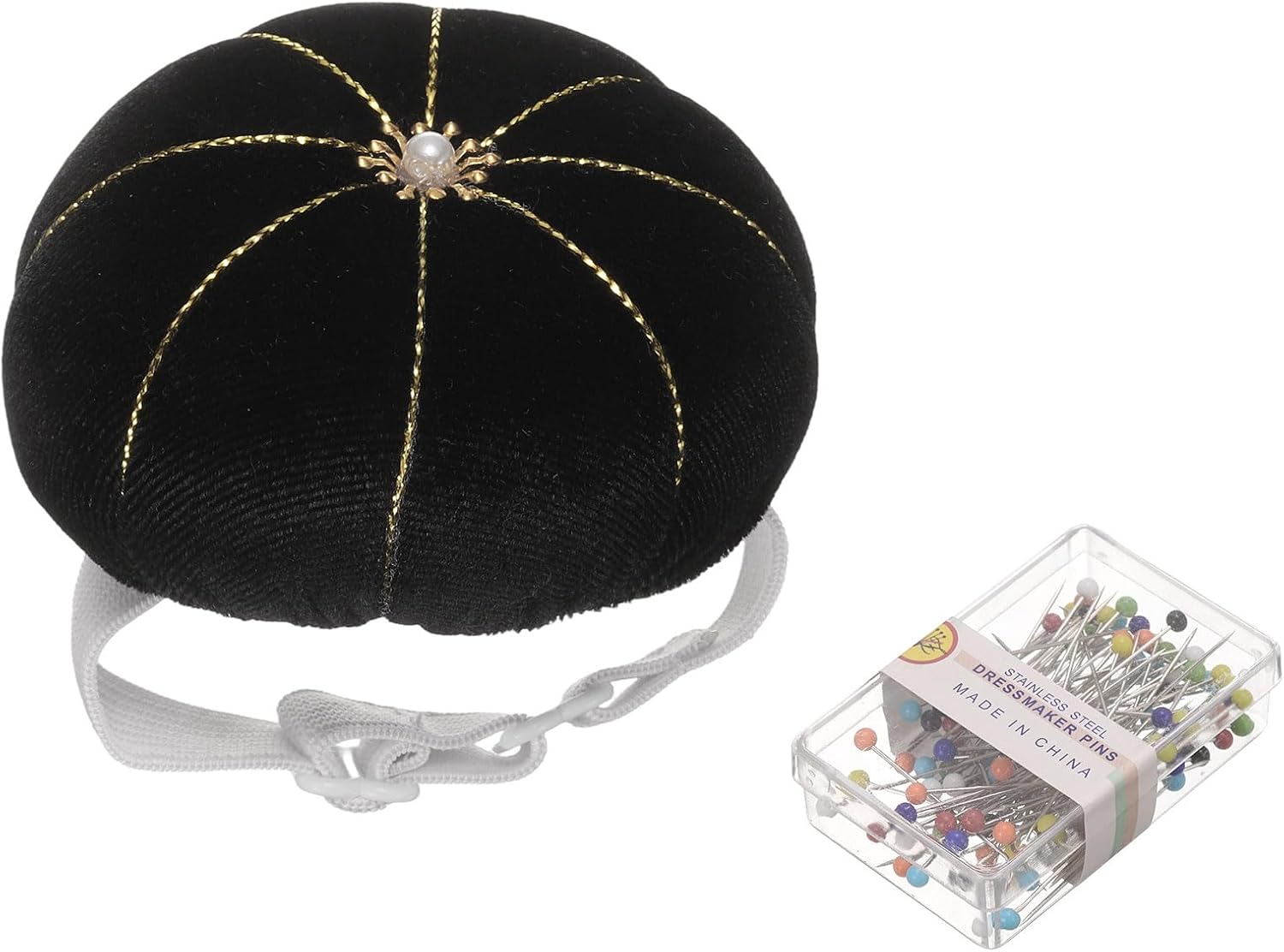 HARFINGTON Wrist Pin Cushion Wristband Sewing Pincushion Polyester Pin Holder Wearable Pumpkin Shaped Needles Wristband with 100 Head Needles for Sewing Quilting DIY Crafts, Black
