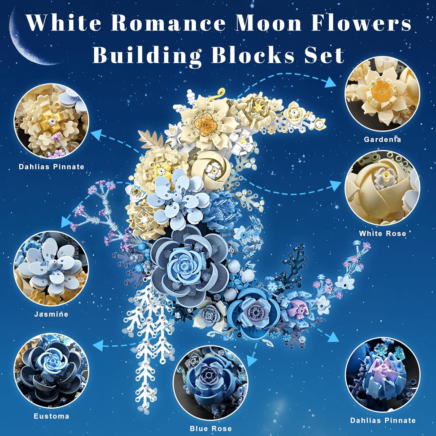 - Unique Crescent Moon Flower Design: Stand out with this creative crescent-shaped blue moon flower bouquet, distinct from standard flower building blocks. Its eye-catching lunar design elevates the building experience, enhancing creativity. Perfect flowers for adults seeking unique home decor. This artificial flower is compatible with Lego flowers