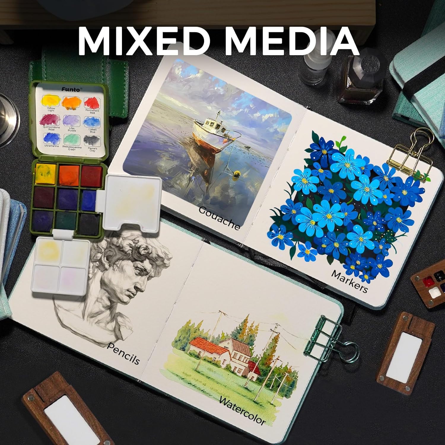Funto Watercolor Journal, 4.7x4.7, 24 Sheets, 100% Cotton Cold Press, 300gsm/140lb, Inner Paper Pocket, Art Supplies for Mixed Media