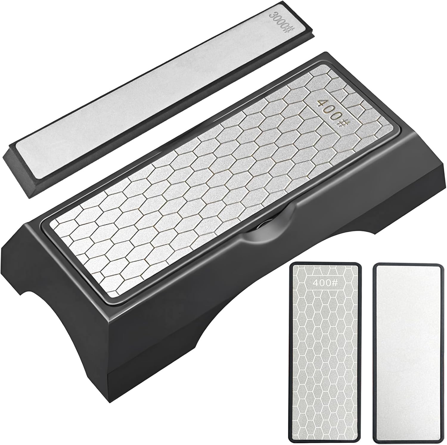 Diamond Sharpening Stone Set, Knife Sharpener Stone, Double-sided Coarse 400 / Fine 1000# | Extra Fine 3000 Grit, 2 Sizes Whetstone Tool with Non-Slip Base, Diamond Plate Honing Stone, Hone Sharpener