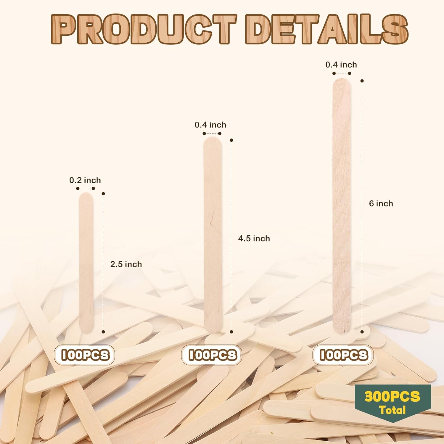 300PCS Wooden Sticks for Craft, 3 Sizes (2.5",4.5",6") Natural Wood Sticks Popsicle for Ice Cream Waxing Hair Removal and Wax Supplies Stir Classroom Art DIY Paint Craft Project Tongue Depressors