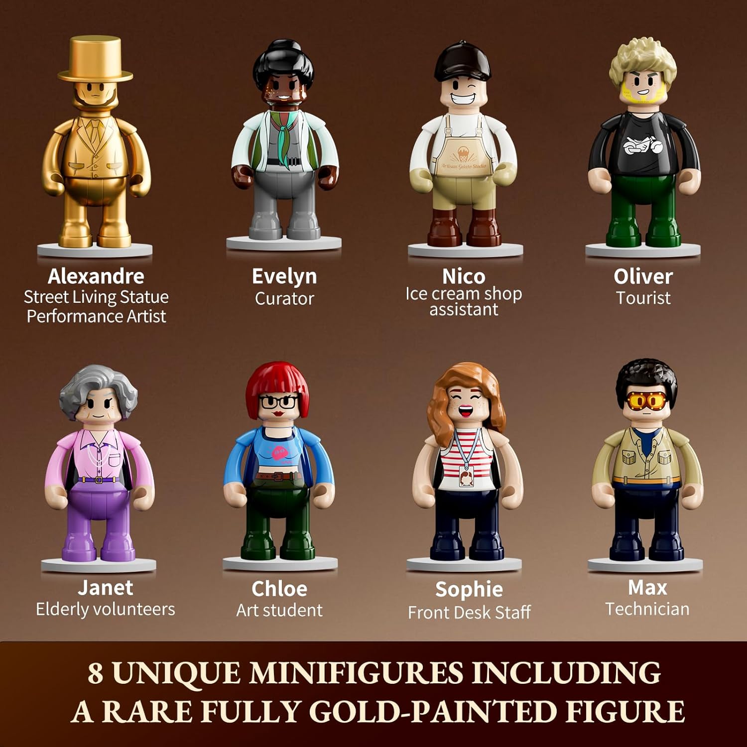 - Exquisite Detail Designs: 60+ printed bricks (no stickers), 11 golden-sprayed bricks for roof decoration, and 8 diverse minifigures, including a rare golden-sprayed minifigure. Detailed interiors: 1F souvenir shop, 2F art exhibition with tributes to Van Gogh and Mondrian, 3F sculpture studio. The exterior features "antique street" stalls, benches, and an ice cream truck.