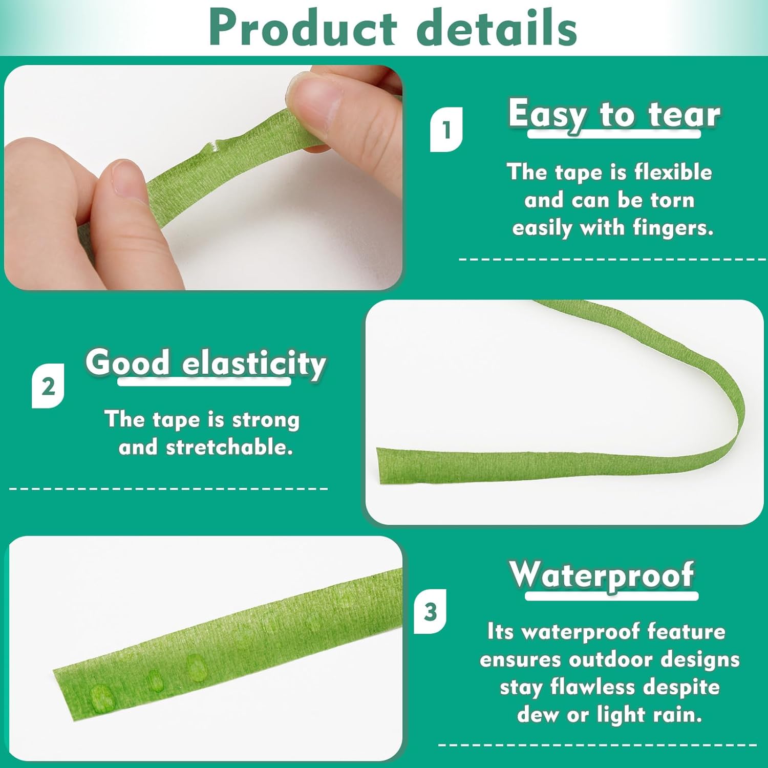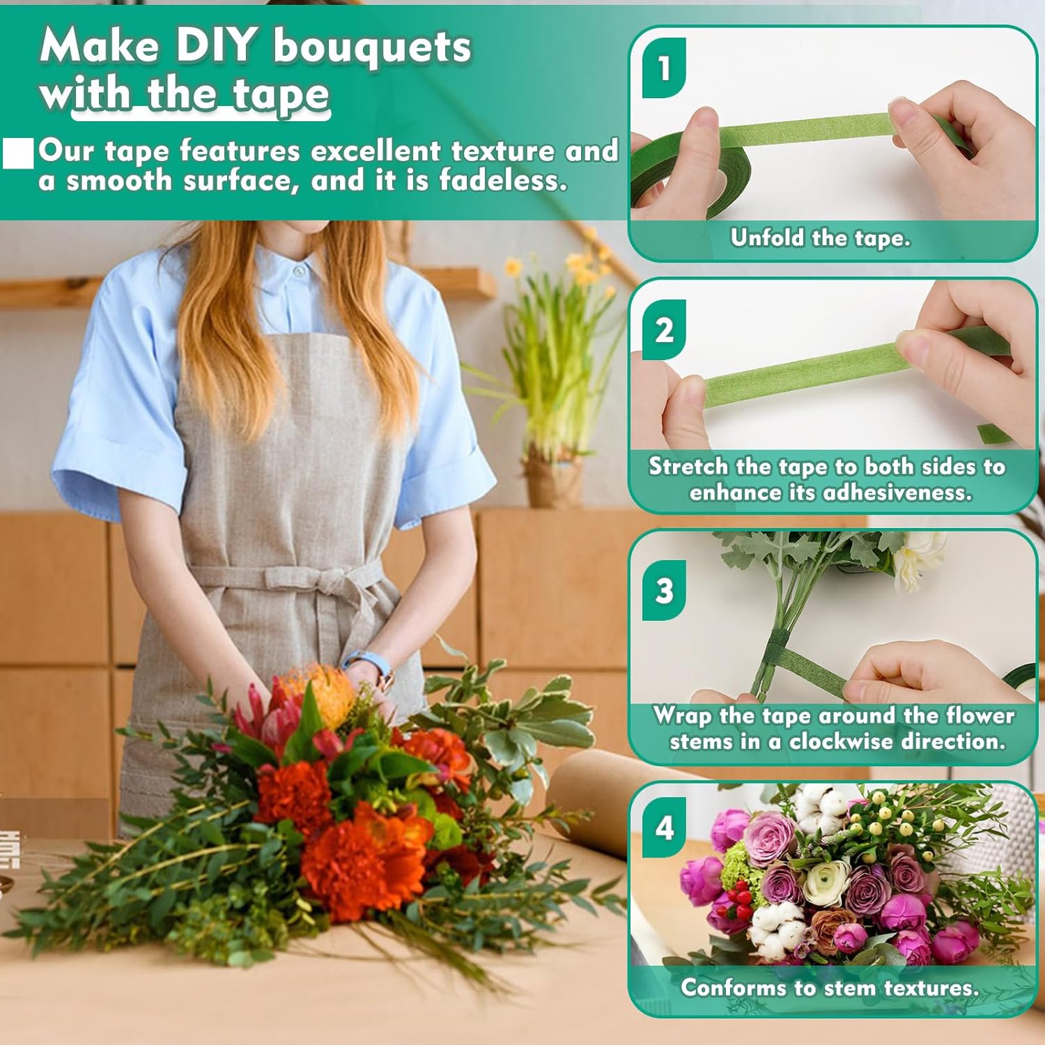 - Waterproof and Does Not Fade: Our green floral tapes still remain sturdy and long-lasting around the flower stems even if they are wrapped around the flower stems in the water. The tape is waterproof, providing maximum viscosity for a wet surface, and will not fade even when immersed in water