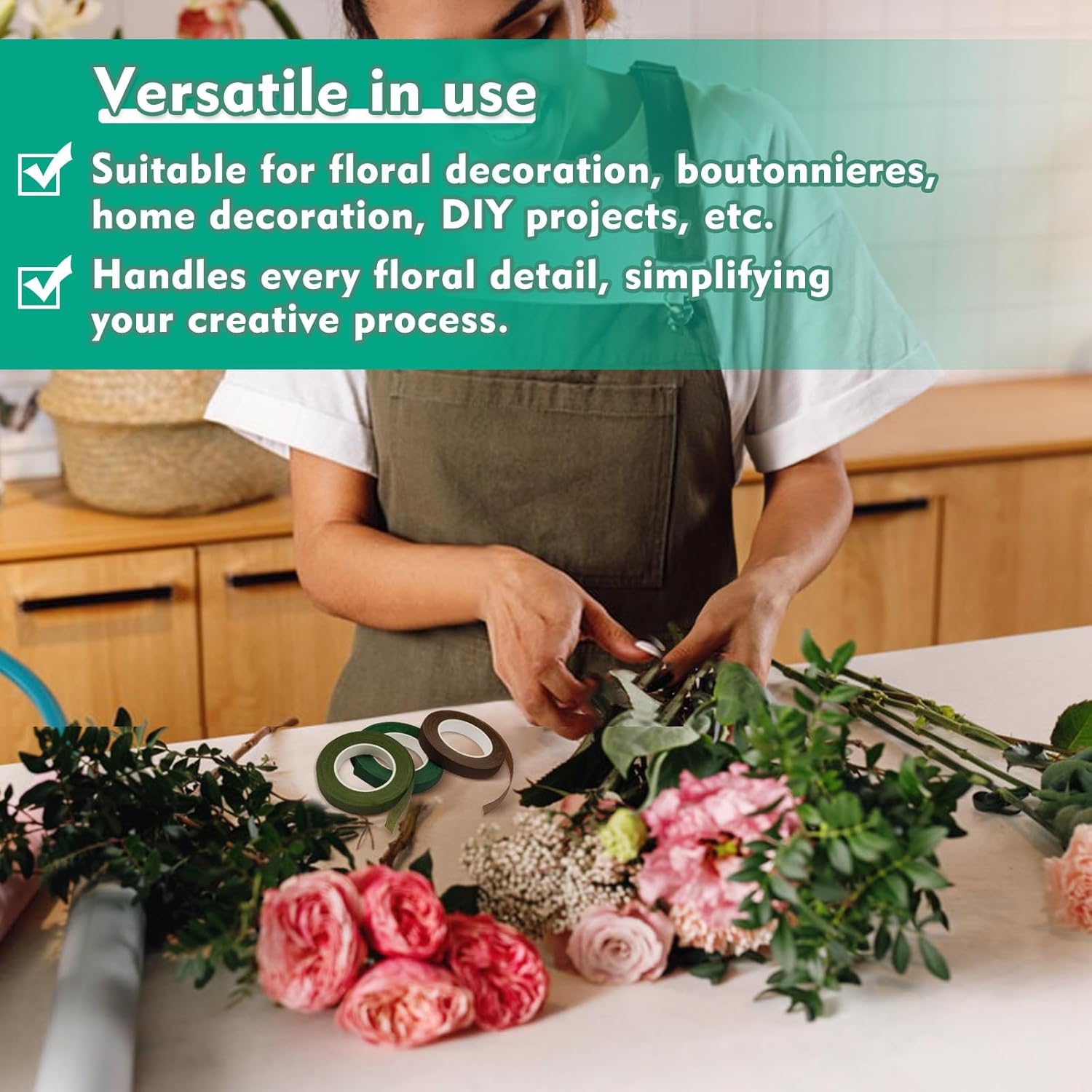 - DIY Creations: It can be used as tape to cover the bouquet to keep it in good condition. It is Ideal for flower arrangement, wedding bouquets, boutonnieres,stem-wrapping bouquets, artificial flowers, flower crowns, flower pens, school projects, DIY scrapbooking, foam wreaths, photo albums, and anything you want to decorate