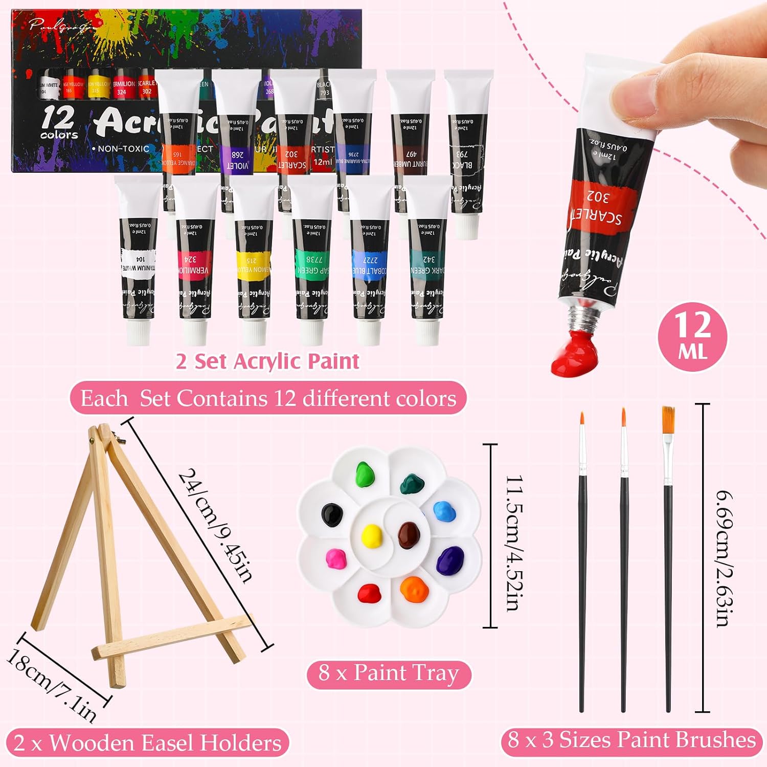 - Extensive Pre Printed Canvases Set: a total of 8 pre printed canvas, with 8 different well designed patterns; Comes with 12 reference color matching cards corresponding to the pattern; 2 packs of acrylic paint set, each pack contain 12 different colors; 2 pcs wooden easel holders; 8 packs of paintbrushes, 3 per pack, including 3 different pen and 8 pcs of white paint trays
