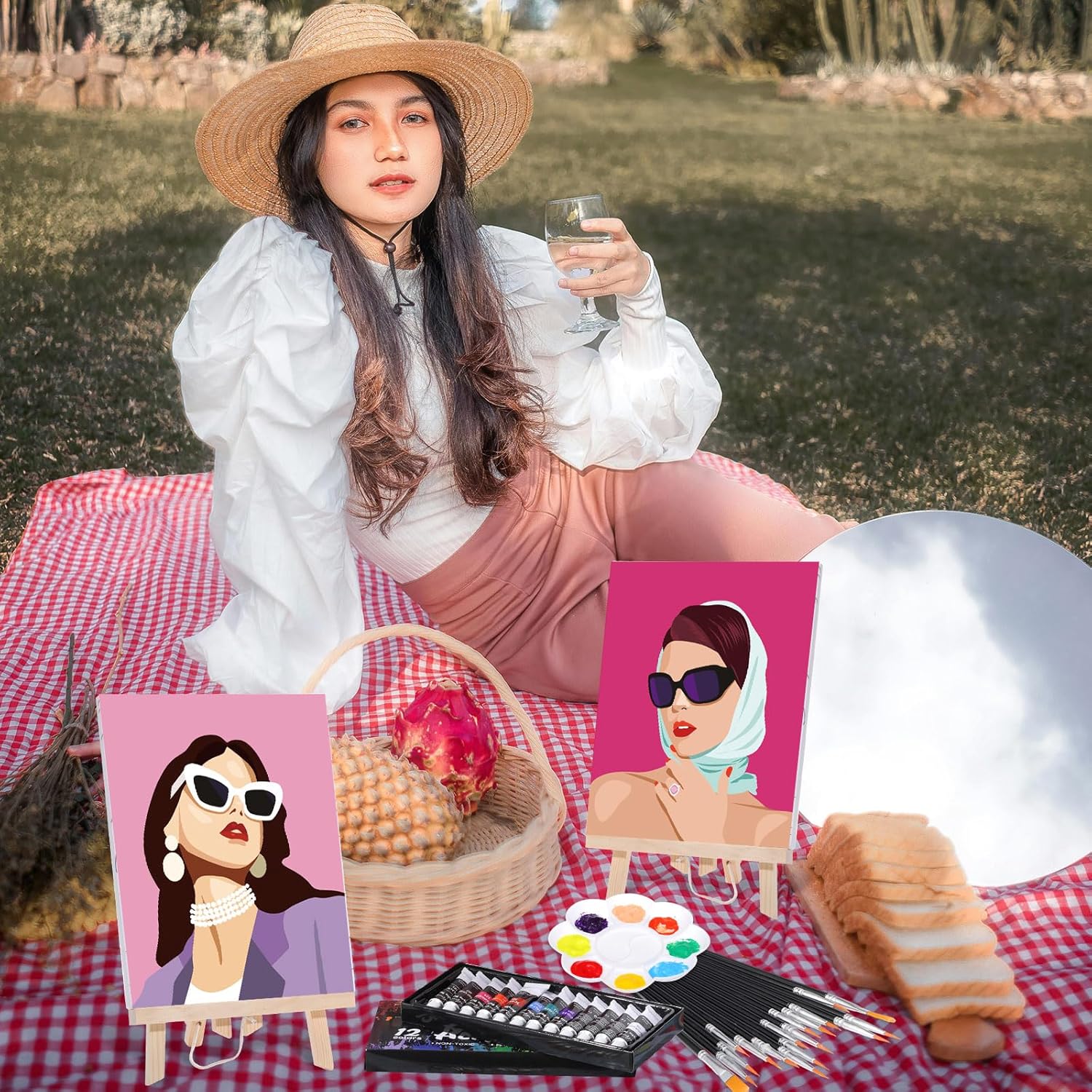 - Extensive Pre Printed Canvases Set: a total of 8 pre printed canvas, with 8 different well designed patterns; Comes with 12 reference color matching cards corresponding to the pattern; 2 packs of acrylic paint set, each pack contain 12 different colors; 2 pcs wooden easel holders; 8 packs of paintbrushes, 3 per pack, including 3 different pen and 8 pcs of white paint trays