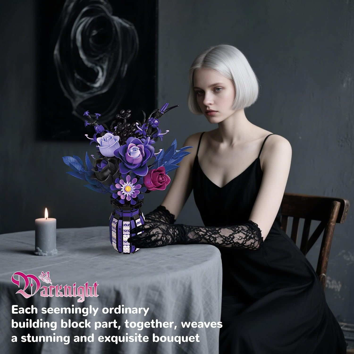 - Gothic Rose Bouquet: Purple, black, and pink bricks create dark-elegant roses with display vase