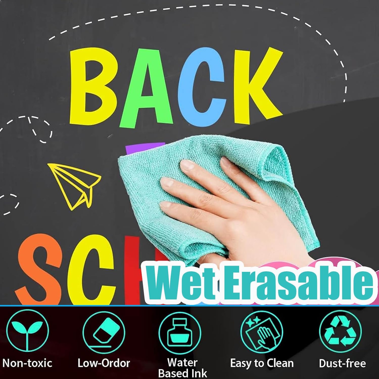 - Effortless Cleanup: Our water-based ink is washable and delivers smudge & dust free - flowing lines that go on smooth and quick dry within minutes. What makes using Liquid Chalk so unique is that you can wet wipe your sign writing art away with a damp cloth, or for more efficiency you can use the Rainbow Blackboard, Whiteboard and Glass Cleaner.Remember to cap the Wet erasable glass pen window marker after each use to prevent drying out.