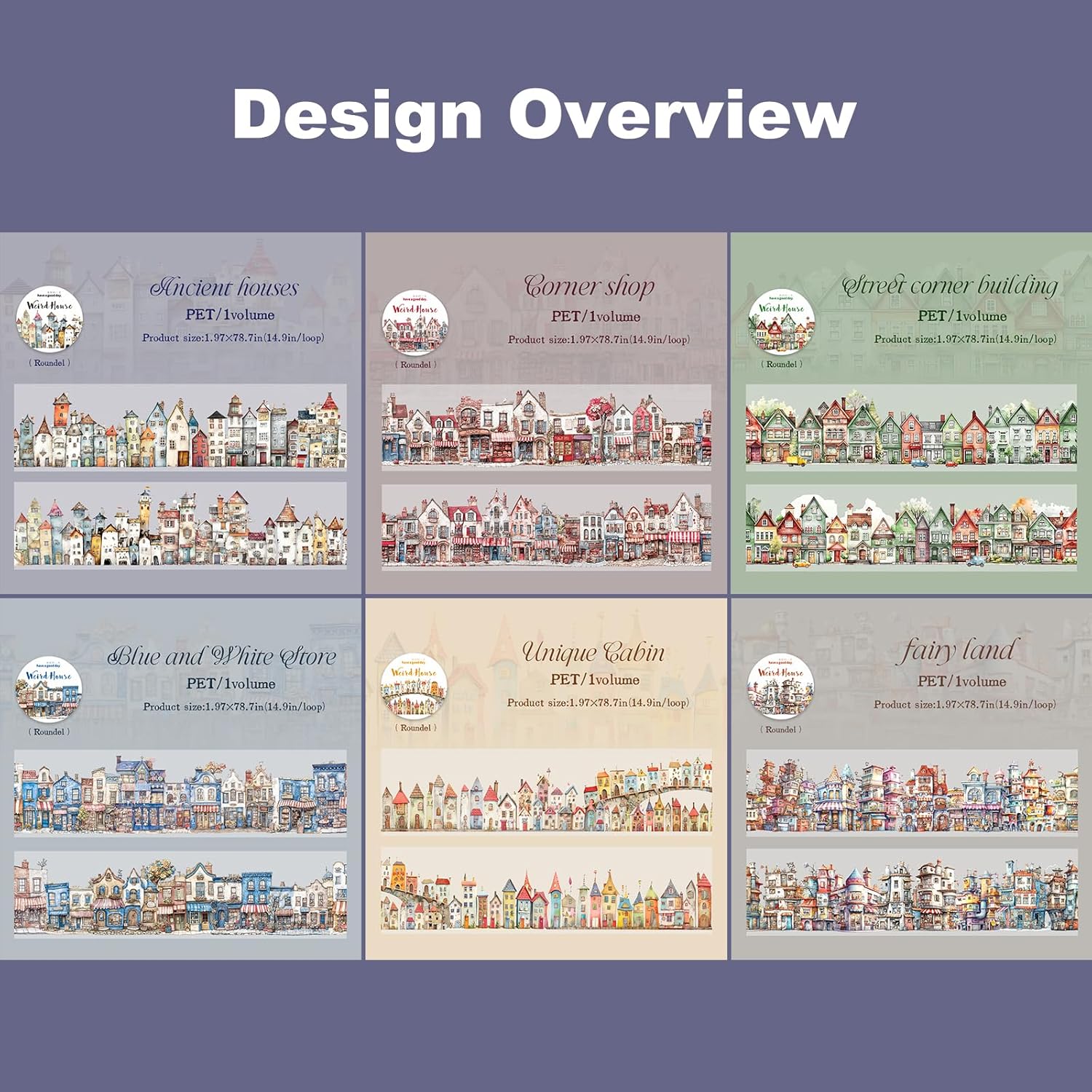 - Whimsical Architectural Designs: This set includes 6 rolls of PET tape, each featuring vintage-style houses, shops, and cottages in a continuous loop (1.97in × 78.7in). Add old-world charm to your scrapbook and journal