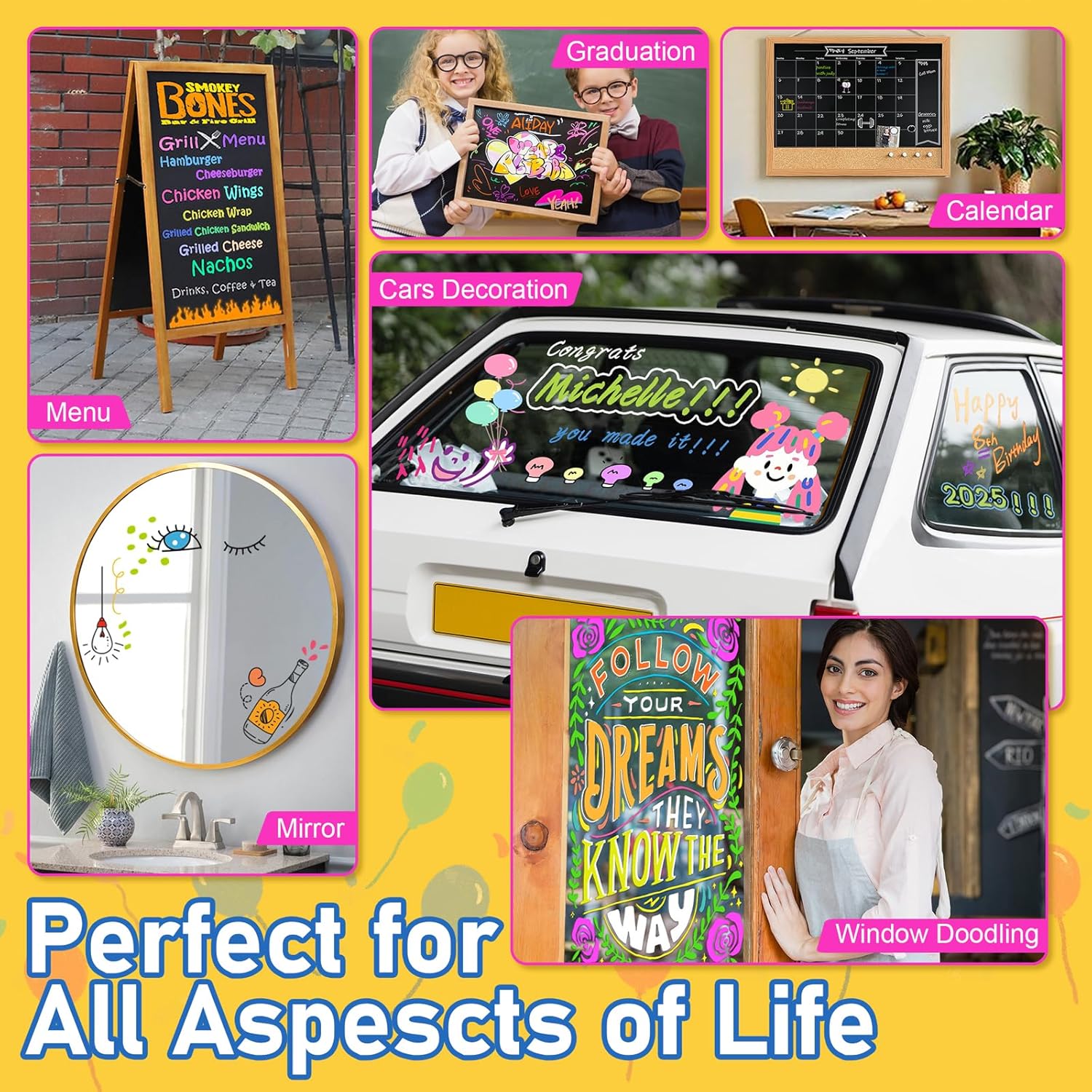 - Perfect for decorating car windows,mirrors and even tires. Car window paint make beautiful artwork to creating holiday decorations for Christmas,Halloween,Birthdays,Graduation,4th of July,Car Decorations and more. Have fun and be creative!