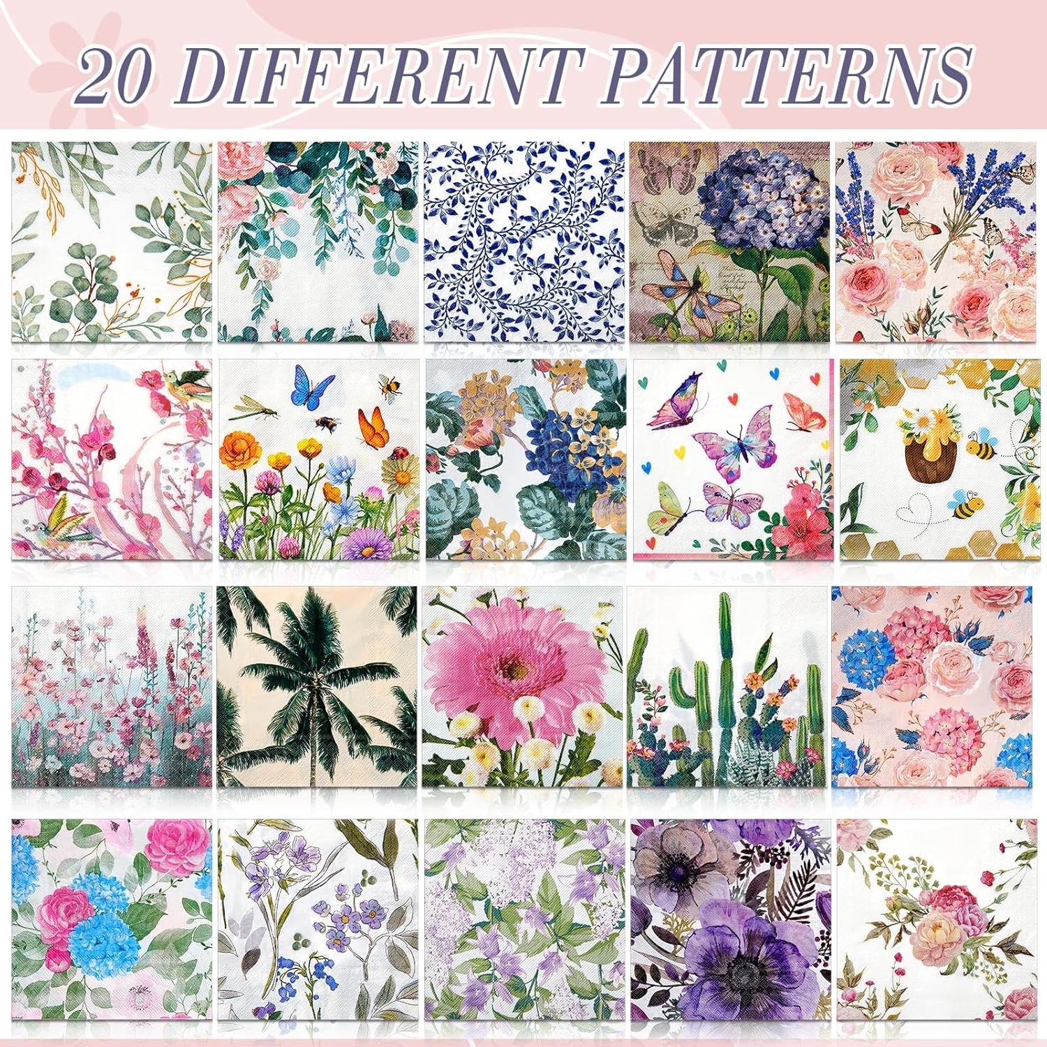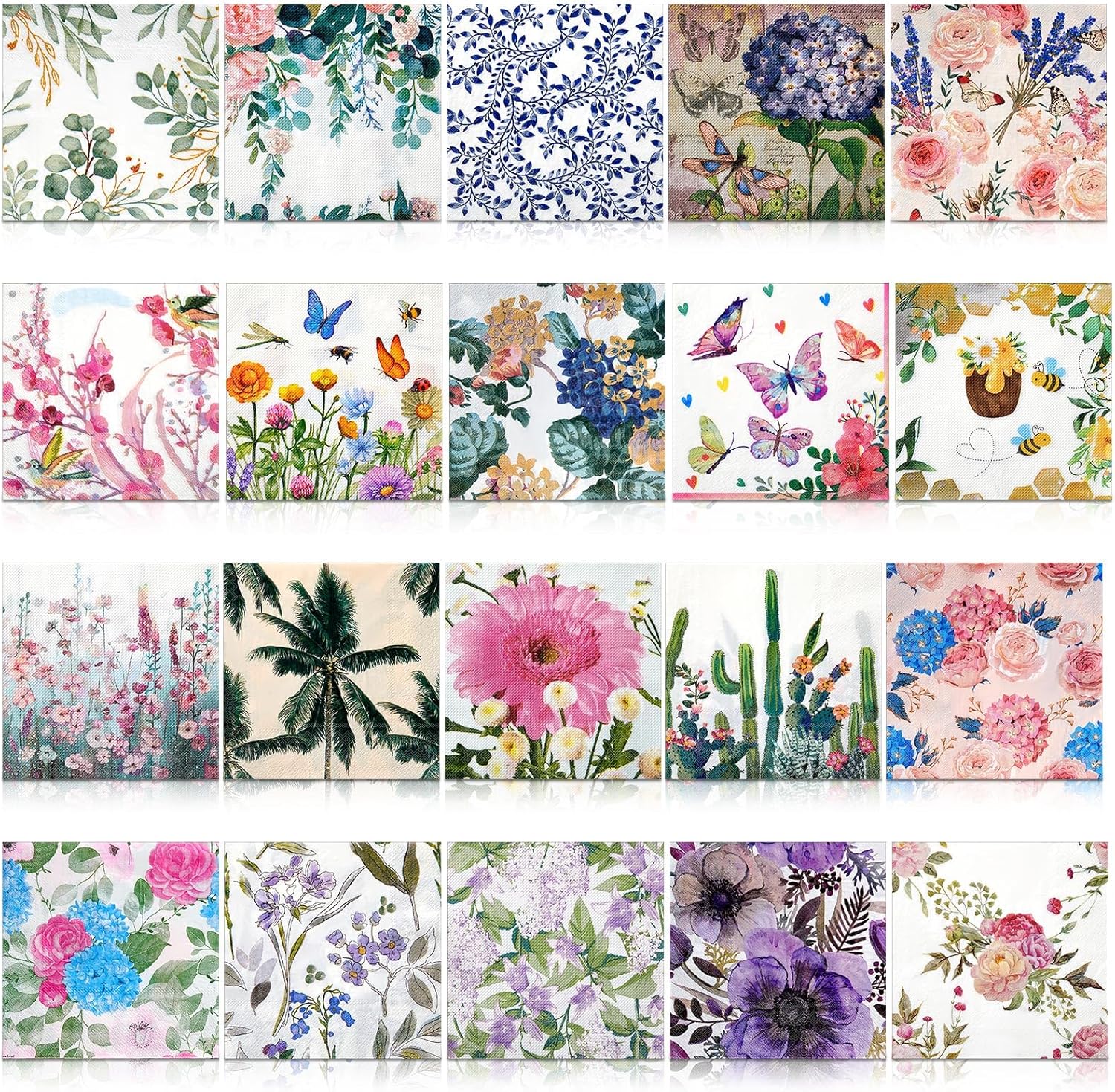 Crtiin 20 Pack Assorted Floral Napkins for Decoupage Toilet Napkins Flower Cocktail Decorative Paper for Birthday Party Beautiful Gorgeous, 20 Styles Each 6.5 inches(Style 5)