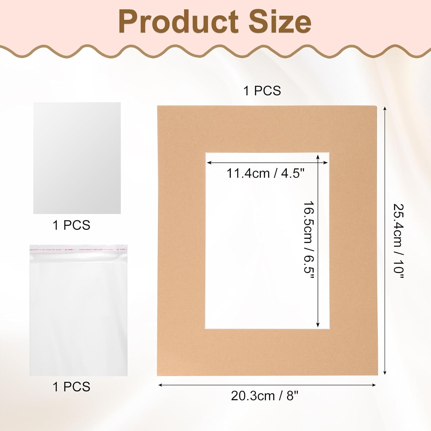 - [Picture Mats] Material: Cardboard; Color: Kraft Paper Color; Total Size: 20.3 x 25.4 cm / 8" x 10"; Bevel Cut Opening Size: 11.4 x 16.5 cm / 4.5" x 6.5"(L*W); Fit Picture Size: 5" x 7"; Package Content: 1 Pcs x Picture Mats; 1 Pcs x Backing; 1 Pcs x Clear Bag