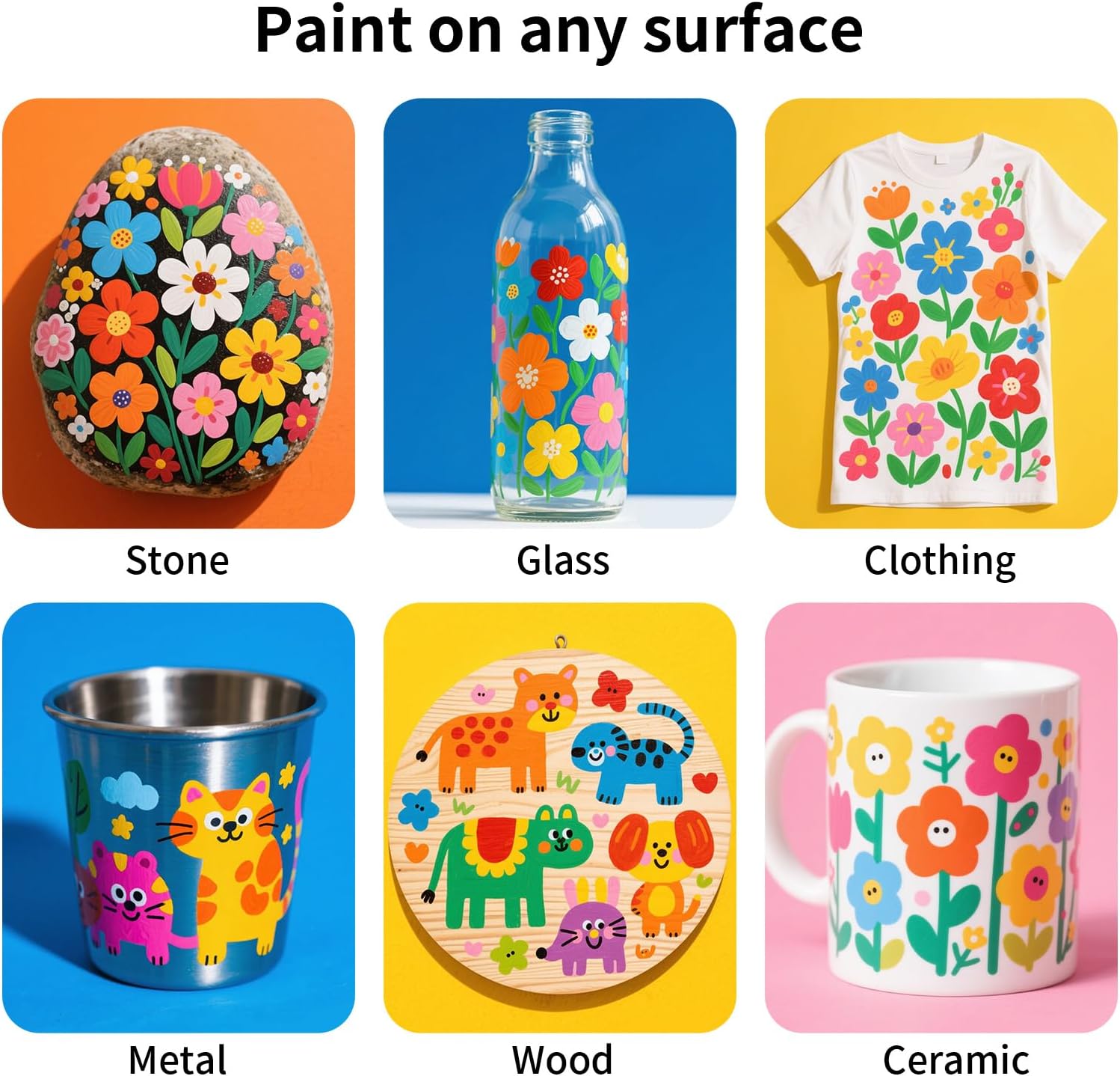 - 【Works on Multiple Surfaces-Creativity Without Limits】:Our acrylic paint pens write effortlessly on wood, canvas, rocks, glass, fabric, ceramics, paper, and more. Whether you’re into DIY crafts, rock painting, or personalizing gifts, our markers are the reliable tools you can count on.